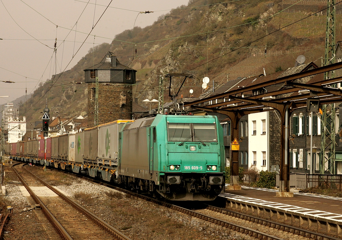 185 609 mit einem KLV zieht durch den Bahnhof Kaub am 16.03.2022