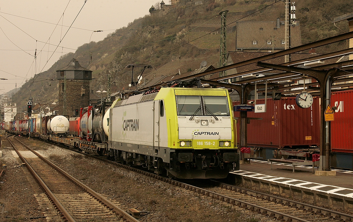 Captrain 186 158 durchfährt den Bahnhof Kaub am 16.03.2022.