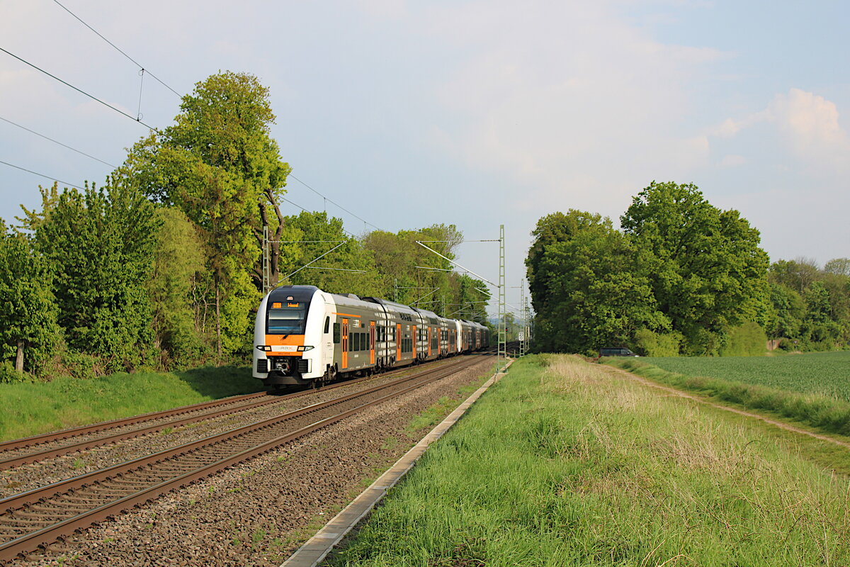 National Express 9 442 353 ist am 02.05.2022 als RB48 nach Wuppertal-Oberbarmen auf der linken Rheinstrecke bei Bornheim unterwegs.
