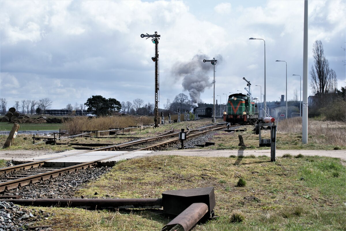 Polen Parowozownia Wolsztyn Strecke 328 Leszno-Wolsztyn-Zbąszynek: Ol49-69 + B11p 042-1 + B11p 343-3, Zug 77228 Wolsztyn-Leszno, und SM42-2595, Nowawieś Mochy, 5. April 2022. An diesem Tag kam es in der Station Nowawieś Mochy zu einer ausserordentlichen Zugkreuzung. Wurde SM42-2595 in Wolsztyn benötigt für Bauzugdienste auf der gesperrten Strecke nach Grodzisk? Loktausch?