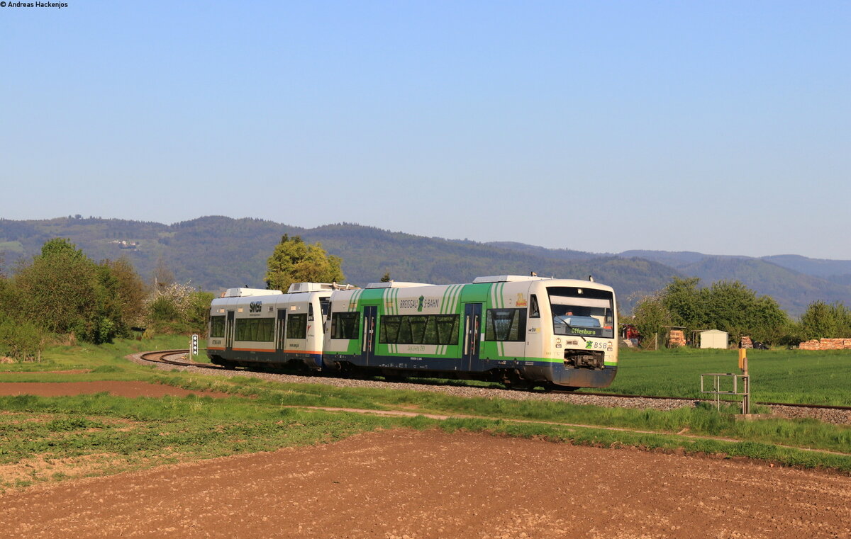 DB 628 436  Anna  und 628 486  Maria  sind am 01.05.2022 im Rahmen ihrer Abschiedsfahrt bei DB Regio in Baden-Württemberg von Ulm nach Triberg unterwegs. Hier sind die beiden mintfarbenen Triebwagen zwischen Altshausen und Bad Saulgau unterwegs.