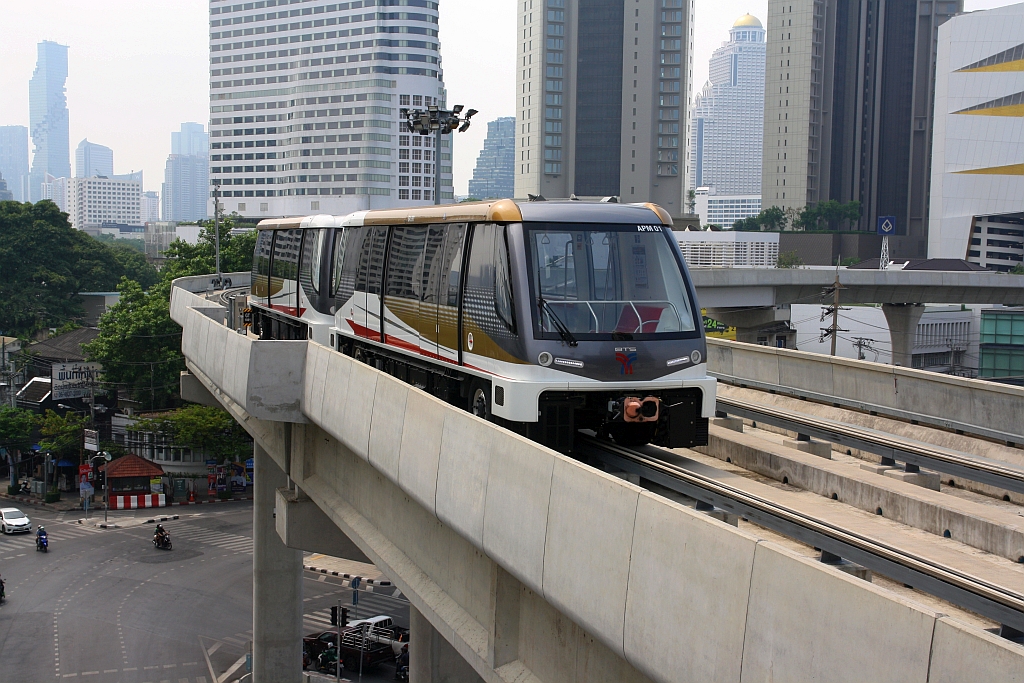 BTS GA201 mit GA101 (Type APM 300, CRRC Puzhen Bombardier, Baujahr 2020) am 30.April 2022 kurz vor der Khlong San Station (G3).