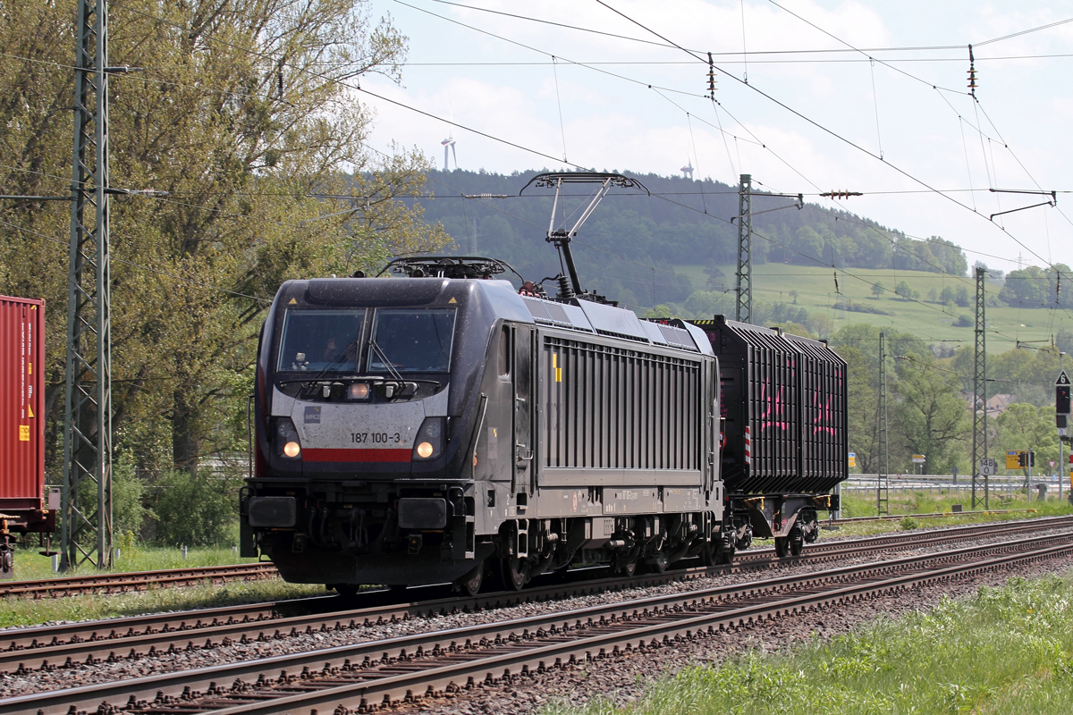HSL Logistik GmbH, Hamburg [D] mit der Railpool Lok  187 307-4  [NVR-Nummer: 91 80 6187 307-4 D-Rpool] und KLV-Zug am 09.05.22 Durchfahrt Bf. Saarmund.