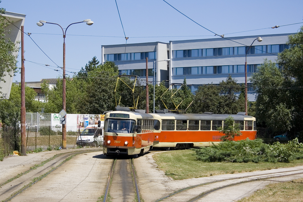 Am 8. Juli 2010 durchfährt das T3 SUCS - Paar 7807 sowie 7808 als Linie 2 die Endschleife Zlaté piesky. Während der geführte Wagen mittlerweile dem Wertstoffkreislauf zugeführt worden ist, existiert der Wagen 7807 heute nach wie vor als mobiles Kulturdenkmal.
