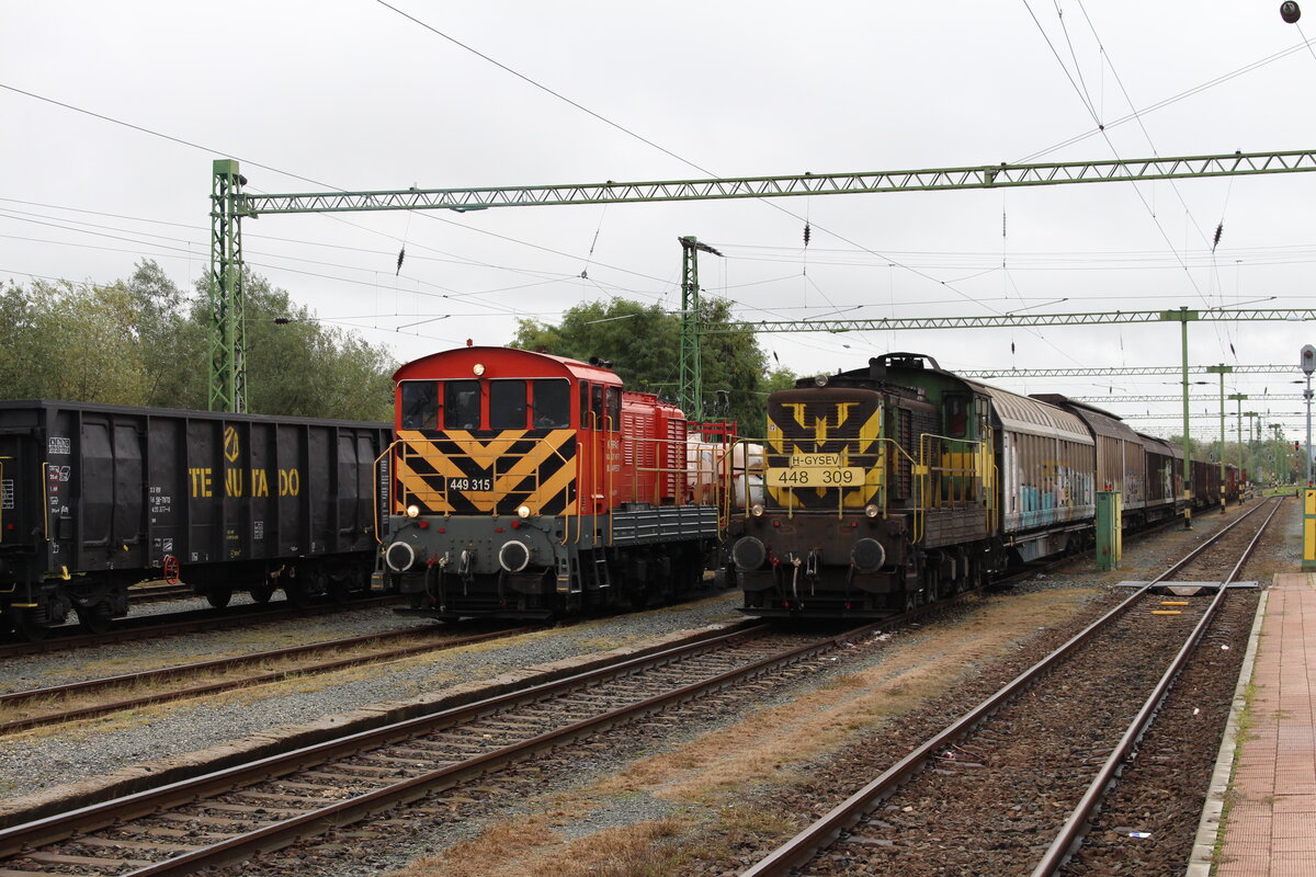Während am 30.9.2022 die GySEV 448 309 den örtlichen Verschubtätigkeiten in Śzentgotthart fertig ist, durchfährt die 449 315 der Kárpát Vasút Kit Budapest mit einem Ks als Unkrautspritzwagen die Bahnhofsgleise.