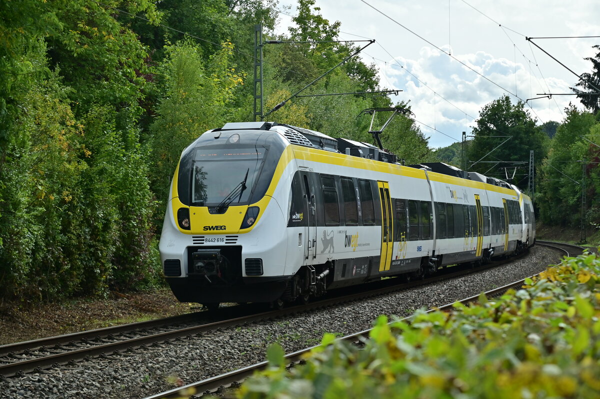 RE10a nach Mannheim geführt vom 8442 616 der hier in Neckargerach seinem nächsten Halt Eberbach Neckar durcheilt. 28.9.2022