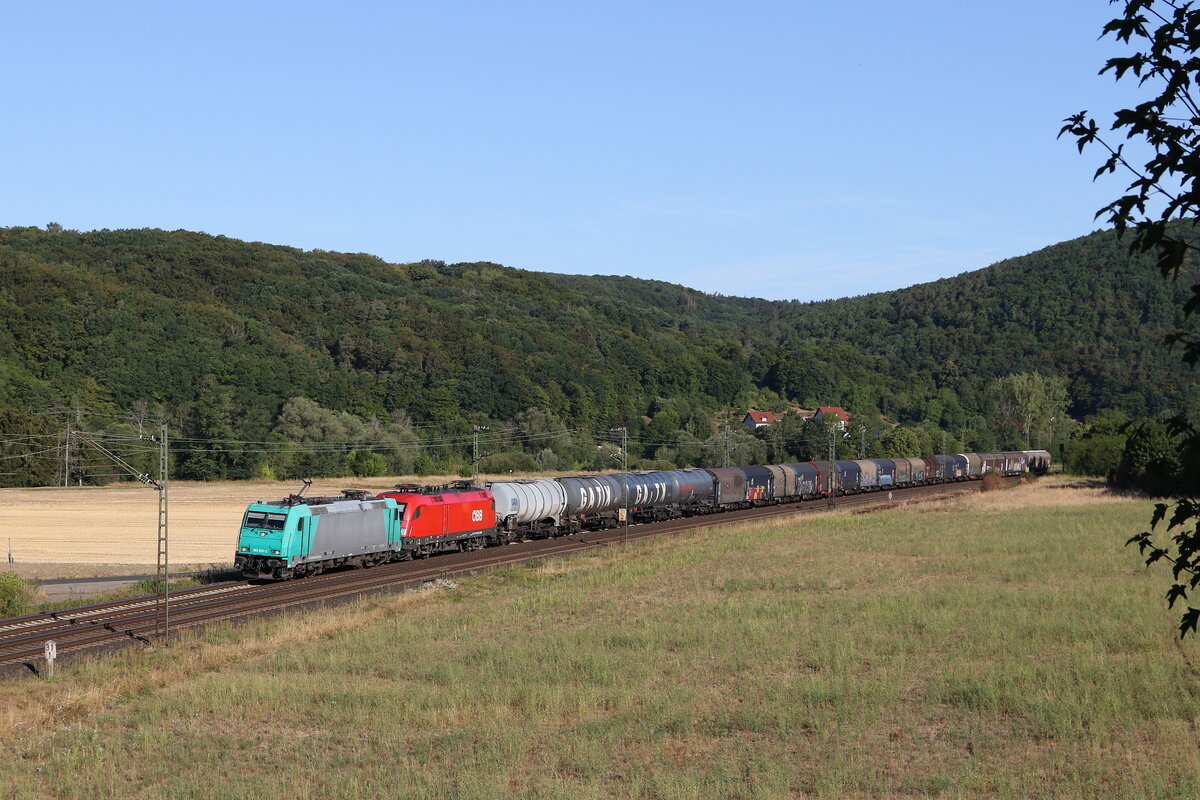 185 615 & 1116 xxx waren am 7. August 2022 mit einem gemischten Güterzug bei Harrbach in Richtung Würzburg unterwegs.