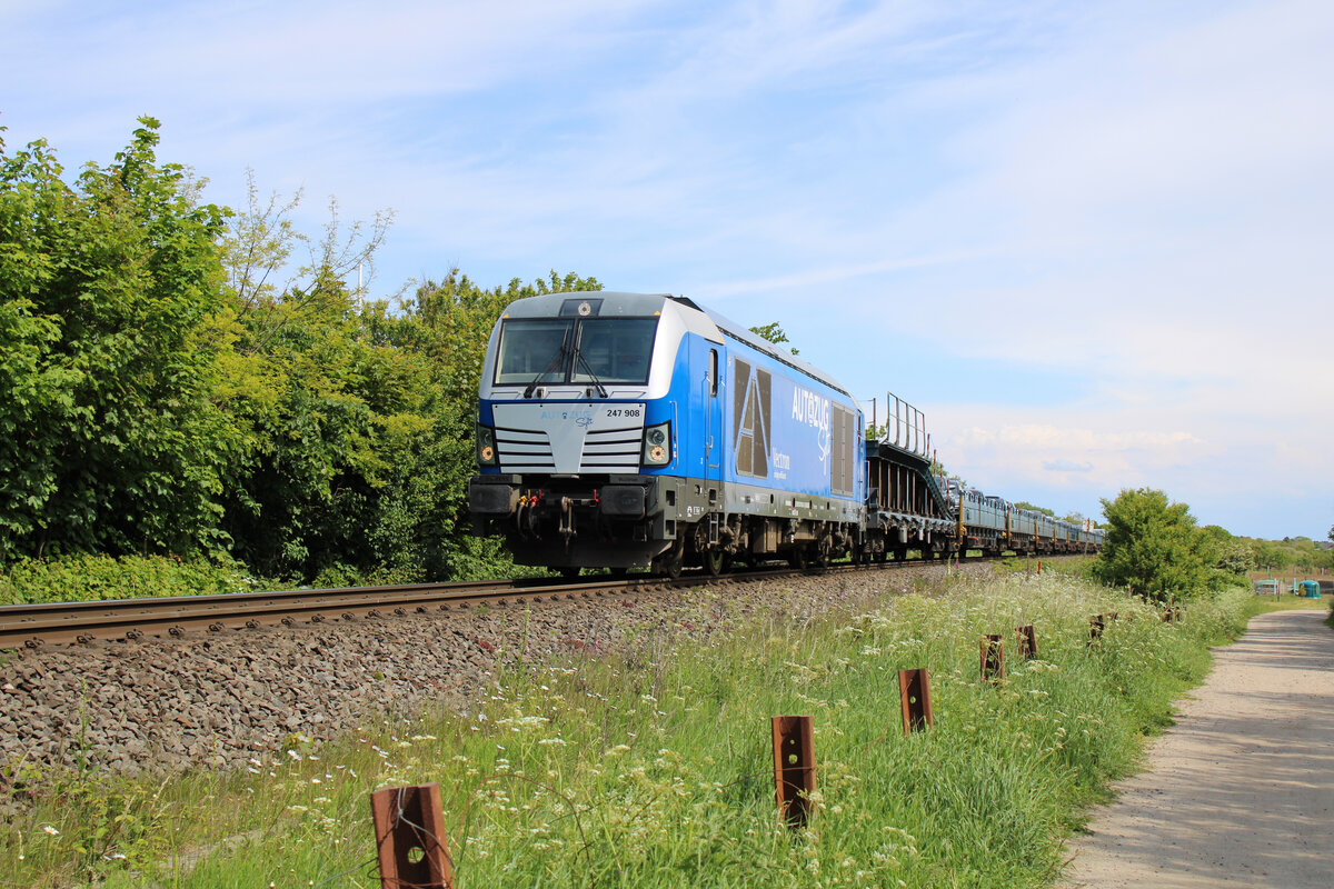 250 007 von Captrain, fotografiert am 06.05. 2022 auf der Hafenbahn Dresden vom Elberadweg aus