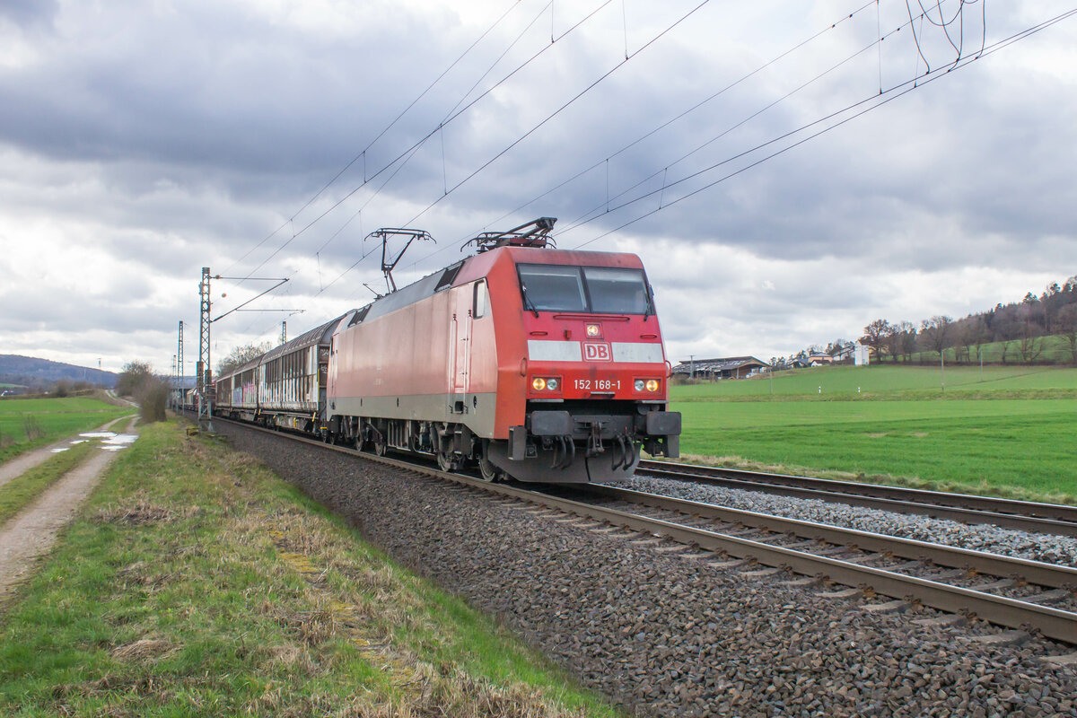 152 168-1 mit einem gemischten zug am 22.03.2023 bei Kerzell.