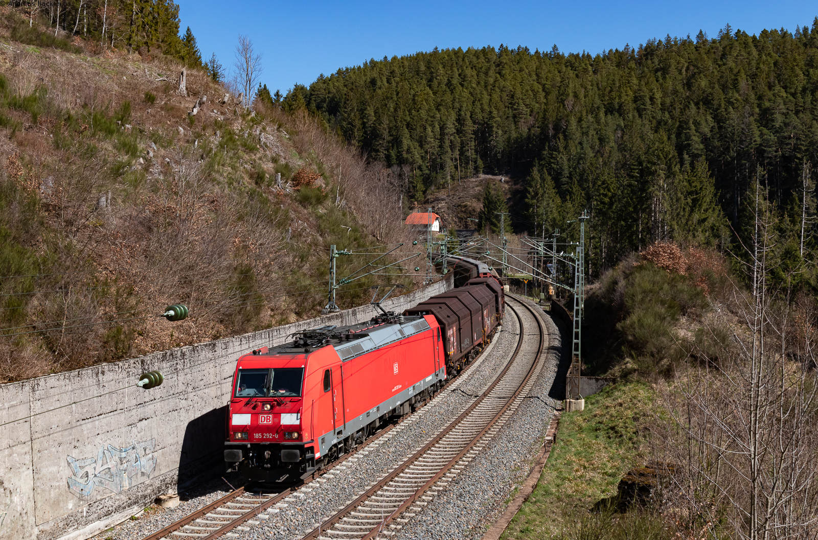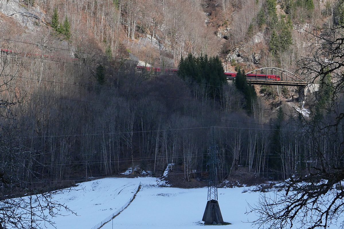 Arlbergbahn Westrampe (||) - Von Braz zum Arlbergbahntunnel hinauf verläuft die Bahnlinie an den nördlichen Hängen des Klostertals. Auf Grund der Topografie waren mehrere Kunstbauwerke wie z.B. Brücken und Lawinenschutzdächer erforderlich. Am 19.02.2023 überquert als letztes der Steuerwagen des RJX 662, Flughafen Wien - Bregenz, den Schanatobel bei Braz.