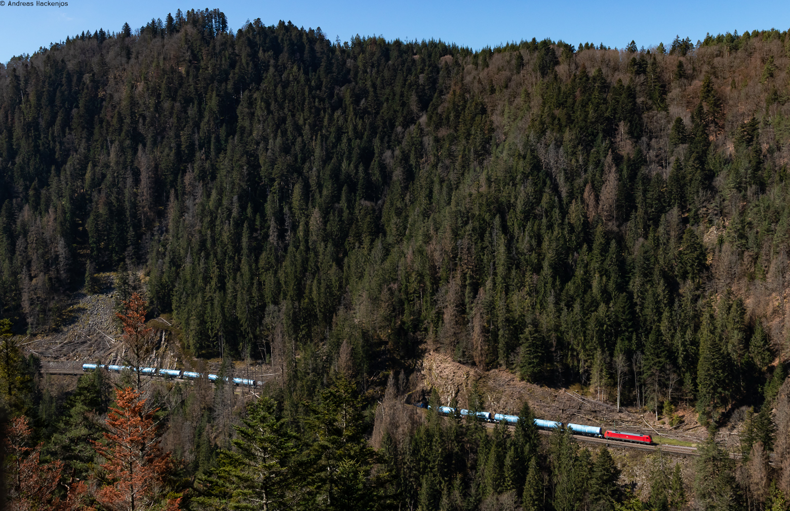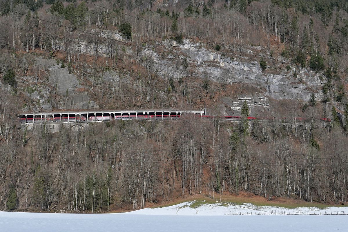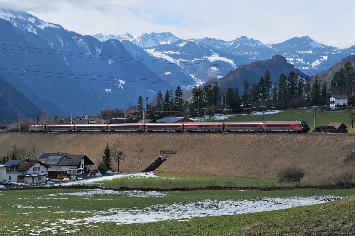 Arlbergbahn Westrampe (|) - Von Braz zum Arlbergbahntunnel hinauf verläuft die Bahnlinie an den nördlichen Hängen des Klostertals. Aus Topografiegründen waren mehrere Kunstbauwerke wie z.B. Tunnel und Lawinenschutzdächer erforderlich. Auf der Fahrt hinauf zum Arlbergtunnel befindet sich von der zweiteiligen Railjet-Garnitur des RJX 167, Zürich - Bratislava, der Steuerwagen der ersten Garnitur kurz vor der Einfahrt in einen Tunnel. Die schiebende Lok mit den zwei letzten Wagen der ersten Garnitur sowie der Steuerwagen und der nachfolgende Wagen der zweiten Garnitur befinden sich unter einem Lawinenschutzdach. Braz, 19.02.2023