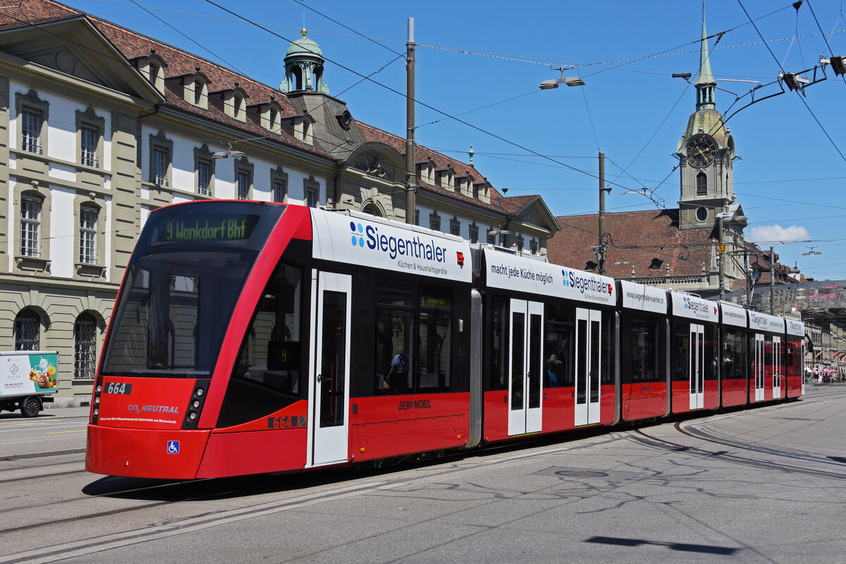 Be 6/8 Combino 664, auf der Linie 9, fährt am 08.07.2022 zur Haltestelle beim Bahnhof Bern.