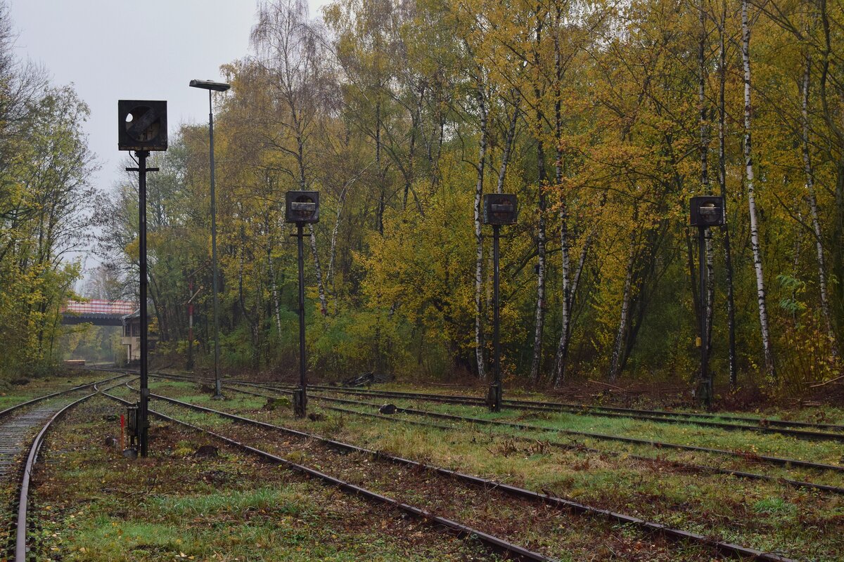 Nicht alle Signale stehen mehr. Einige sind bereits gefallen. Blick von Mariagrube in Richtung Siersdorf. 1982 wurde hier der Personenverkehr eingestellt und im Laufe der Zeit der Güterbahnhof aufgelassen, die Weichen verriegelt und die Signale alle auf Fahrt gestellt. 1998 wurde die Strecke nach Siersdorf entgültig stillgelegt. Ende 2022 wurde die Strecke bis Mariagrube freigeschnitten da es aktuelle Pläne einer Reaktivierung bis Siersdorf und eine Verlängerung bis Baesweiler gibt. Mariadorf 19.11.2022