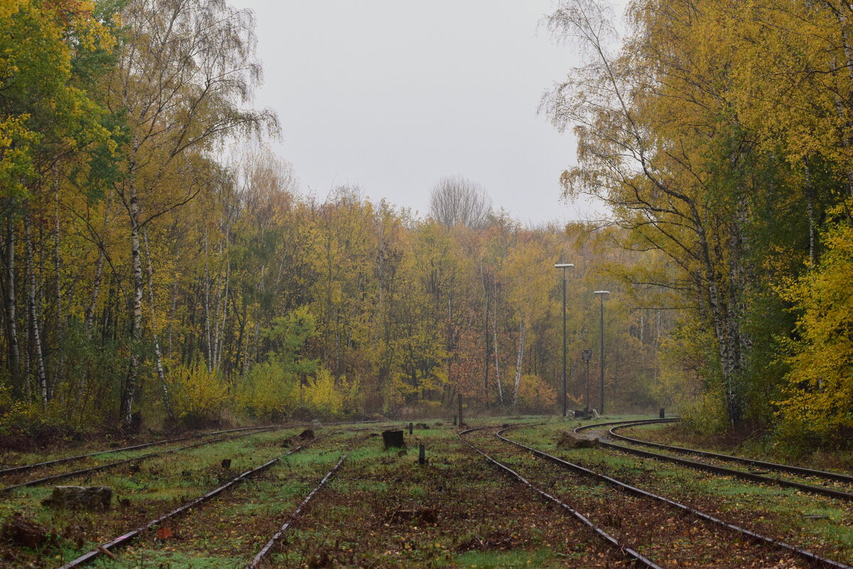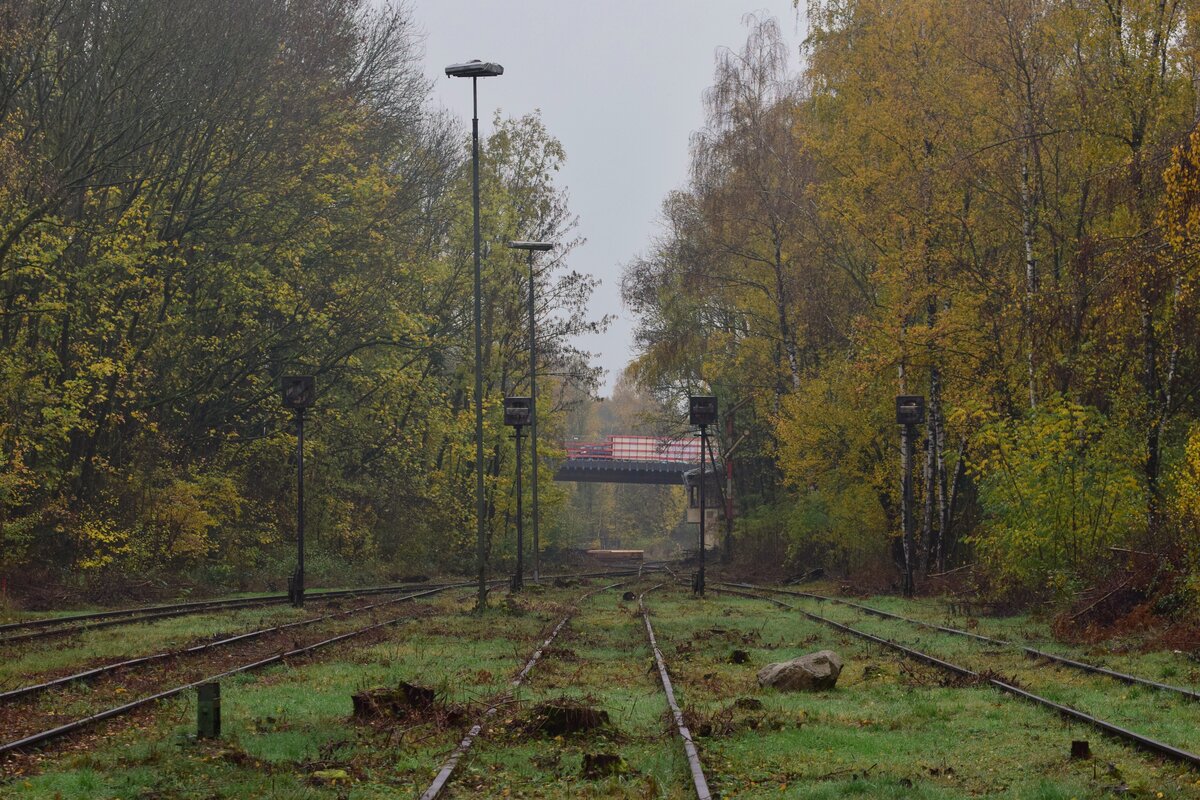 Blick durch den Güterbahnhof Mariagrube in Richtung Siersdorf. 1982 wurde hier der Personenverkehr eingestellt und im Laufe der Zeit der Güterbahnhof aufgelassen, die Weichen verriegelt und die Signale alle auf Fahrt gestellt. 1998 wurde die Strecke nach Siersdorf entgültig stillgelegt. Ende 2022 wurde die Strecke bis Mariagrube freigeschnitten da es aktuelle Pläne einer Reaktivierung bis Siersdorf und eine Verlängerung bis Baesweiler gibt. Mariadorf 19.11.2022