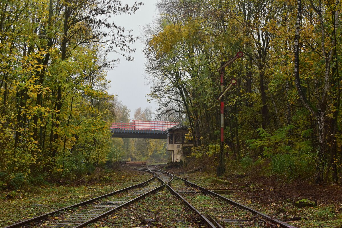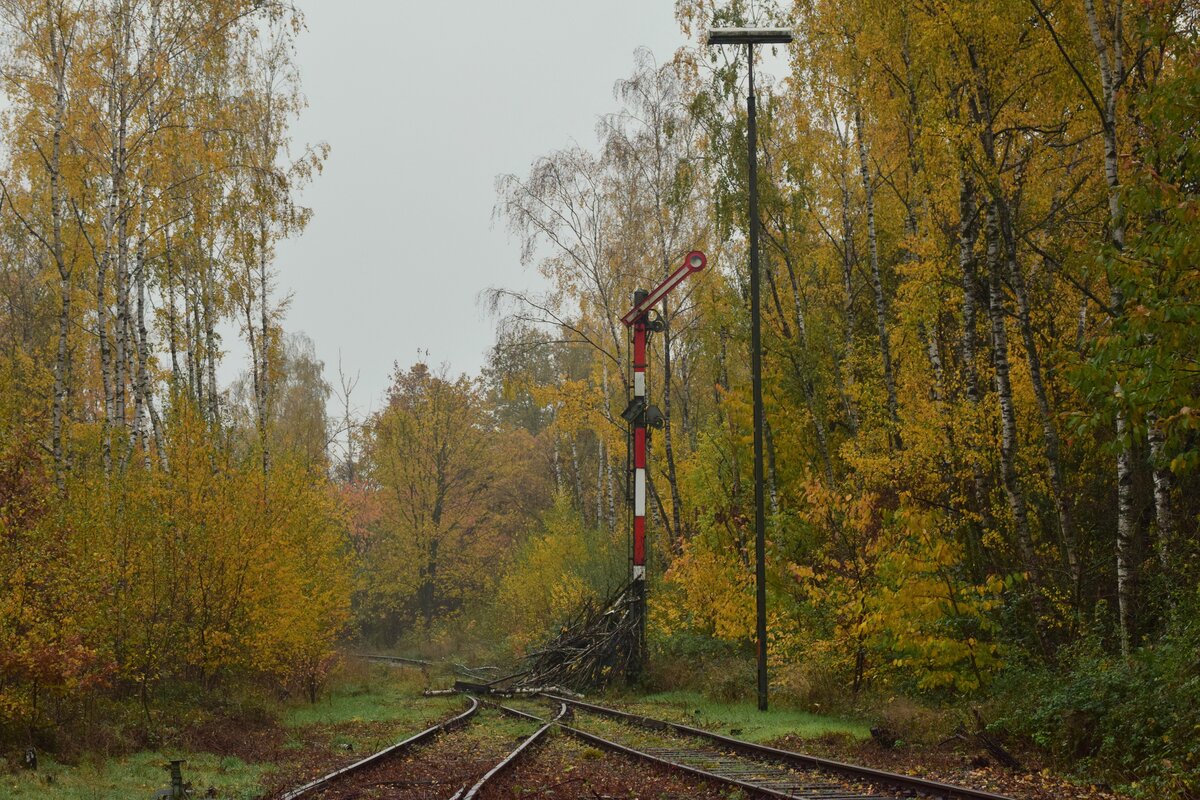 Blick auf die hochstehenden Sperrsignale in Mariagrube. Links wurde das Gleis für die Zugfahrten als der Güterbahnhof ausgelassen wurde. Weichen wurden verreigelt und alle Signale für dieses Gleis auf Fahrt gestellt. 1998 wurde die Strecke nach Siersdorf entgültig stillgelegt. Ende 2022 wurde die Strecke bis Mariagrube freigeschnitten da es aktuelle Pläne einer Reaktivierung bis Siersdorf und eine Verlängerung bis Baesweiler gibt. Mariadorf 19.11.2022