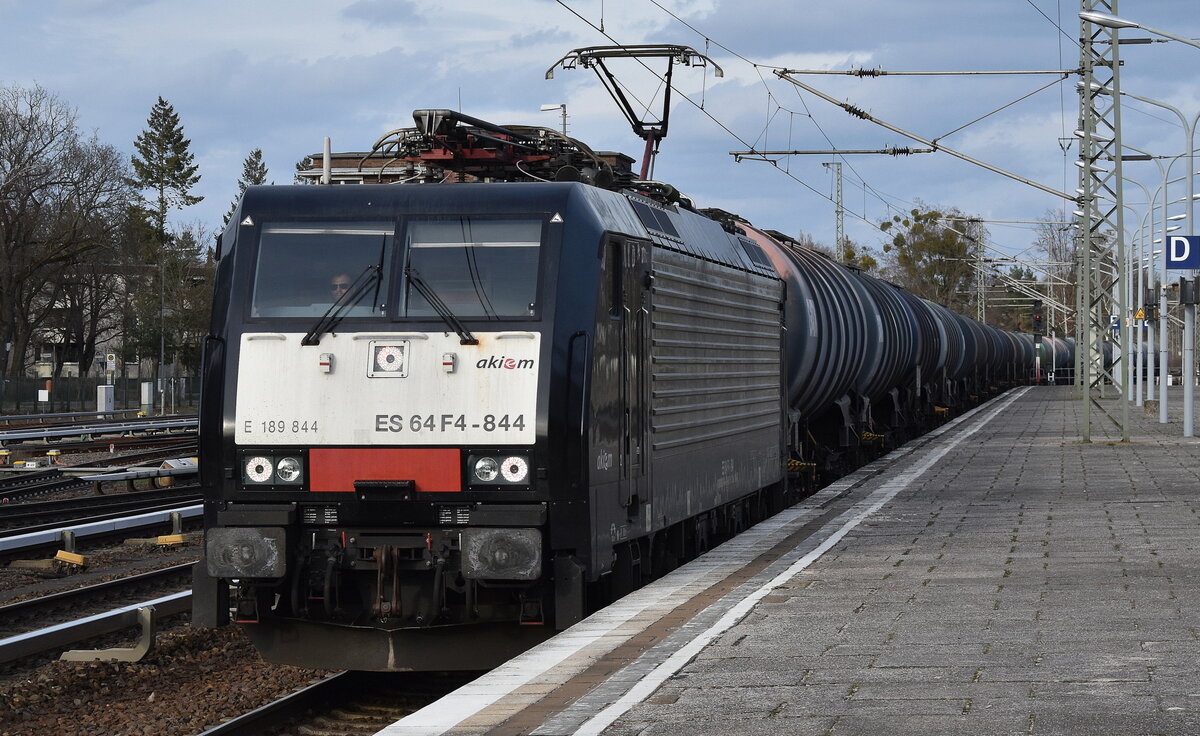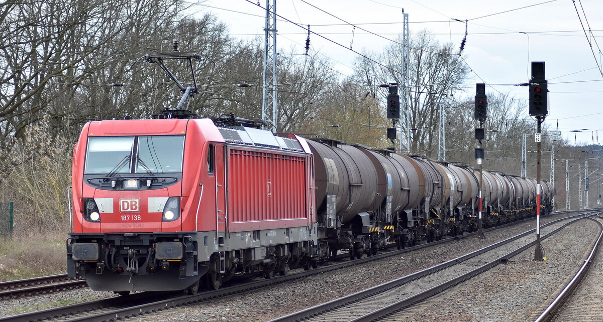 DB Cargo AG [D] mit ihrer  187 138  [NVR-Nummer: 91 80 6187 138-3 D-DB] und einem Kesselwagenzug am 29.03.23 Durchfahrt Bahnhof Saarmund.