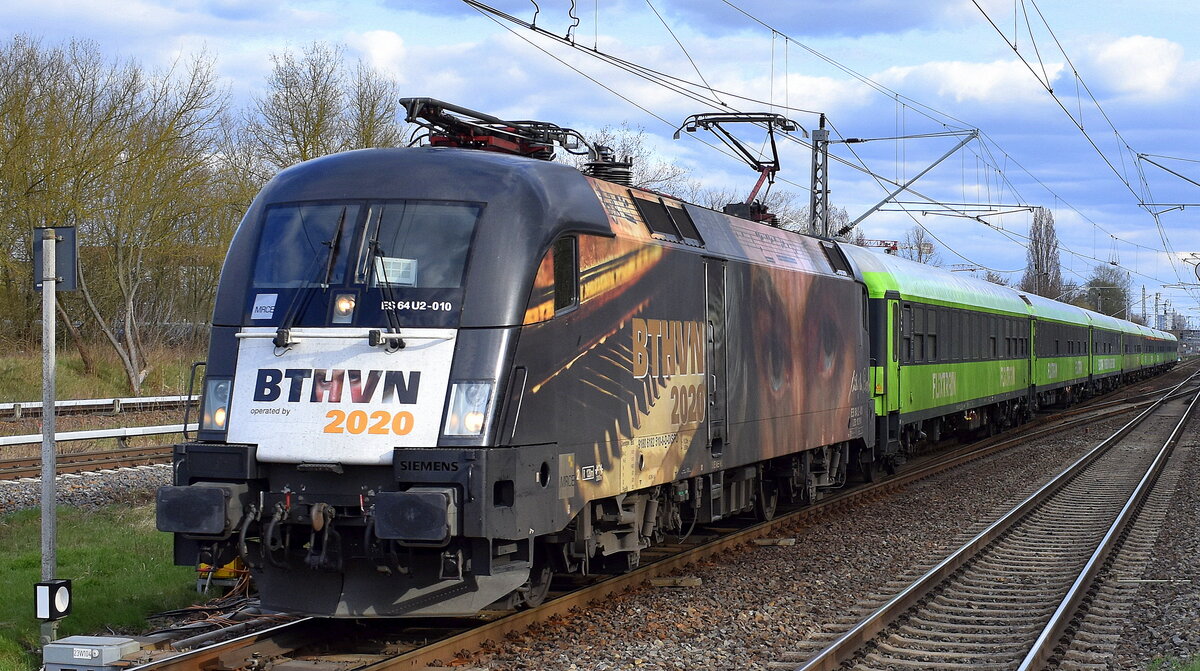 Flixtrain mit dem MRCE Beethoven Taurus "ES 64 U2-010" [NVR-Nummer: 91 80 6182 510-8 D-DISPO] und Wagengarnitur fährt zur Bereitstellung am 04.04.23 Durchfahrt Bahnhof Berlin Hohenschönhausen.
