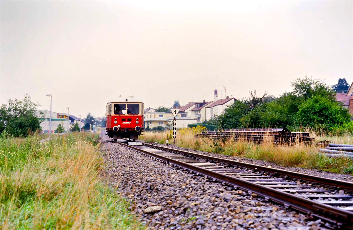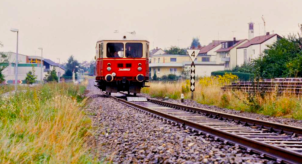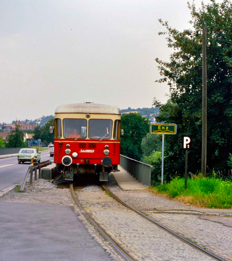 Schlepptriebwagen T 04 der Vaihinger Stadtbahn (WEG) an einem regnerischen Tag. T 04 war zunächst bei der Deutschen Reichsbahn (DR) und danach bei der DB eingesetzt und 1954 von der WEG erworben worden. Er drehte bis 2002 einsam seine Runden zwischen Vaihingen/Enz und Enzweihingen und war 2002 der älteste Schienenbus, der regulär auf deutschen Gleisen gefahren ist. Datum: 06.09.1984
