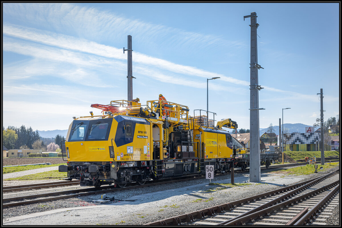 NiegelNagelNeu,..... Im Zuge der Elektrifizierung des GKB-Streckennetzes traf gestern dieser MTW100 von Europten in Wies Eibiswald ein . Hier und in Deutschlandsberg Stadt begannen in den letzten Tagen die Montagearbeiten an den bereits gestellten Fahrleitungsmasten . 5.April 2023