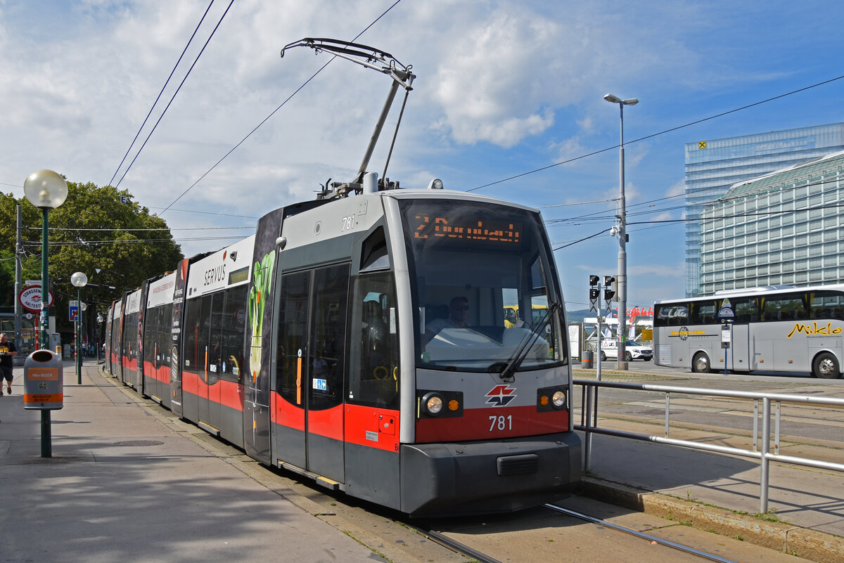 Siemens ULF Tram 781, auf der Linie 2, bedient am 03.09.2022 die Haltestelle Schwedenplatz.
