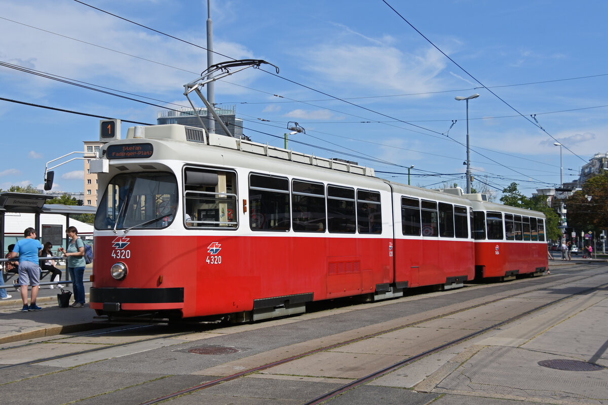 Typ E2 Tram 4320 zusammen mit dem AW 1494, auf der Linie 1, bedient am 03.09.2022 die Haltestelle Schwedenplatz.