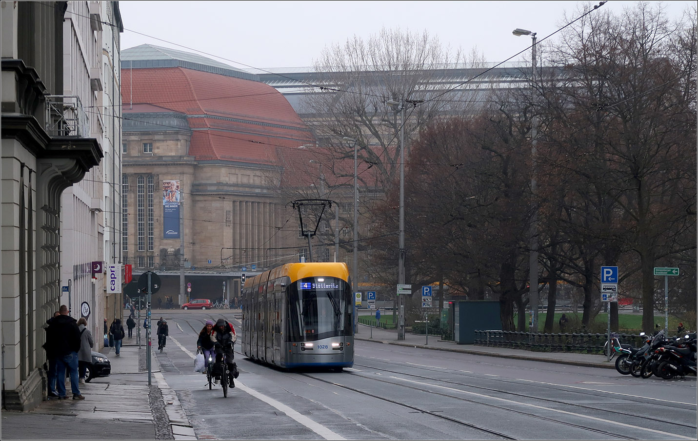 Von der Haltestelle Hauptbahnhof kommend durchfährt NGT10 XL-Wagen 1028 die Goethestraße in Richtung Augustusplatz. Im Hintergrund der Hauptbahnhof.