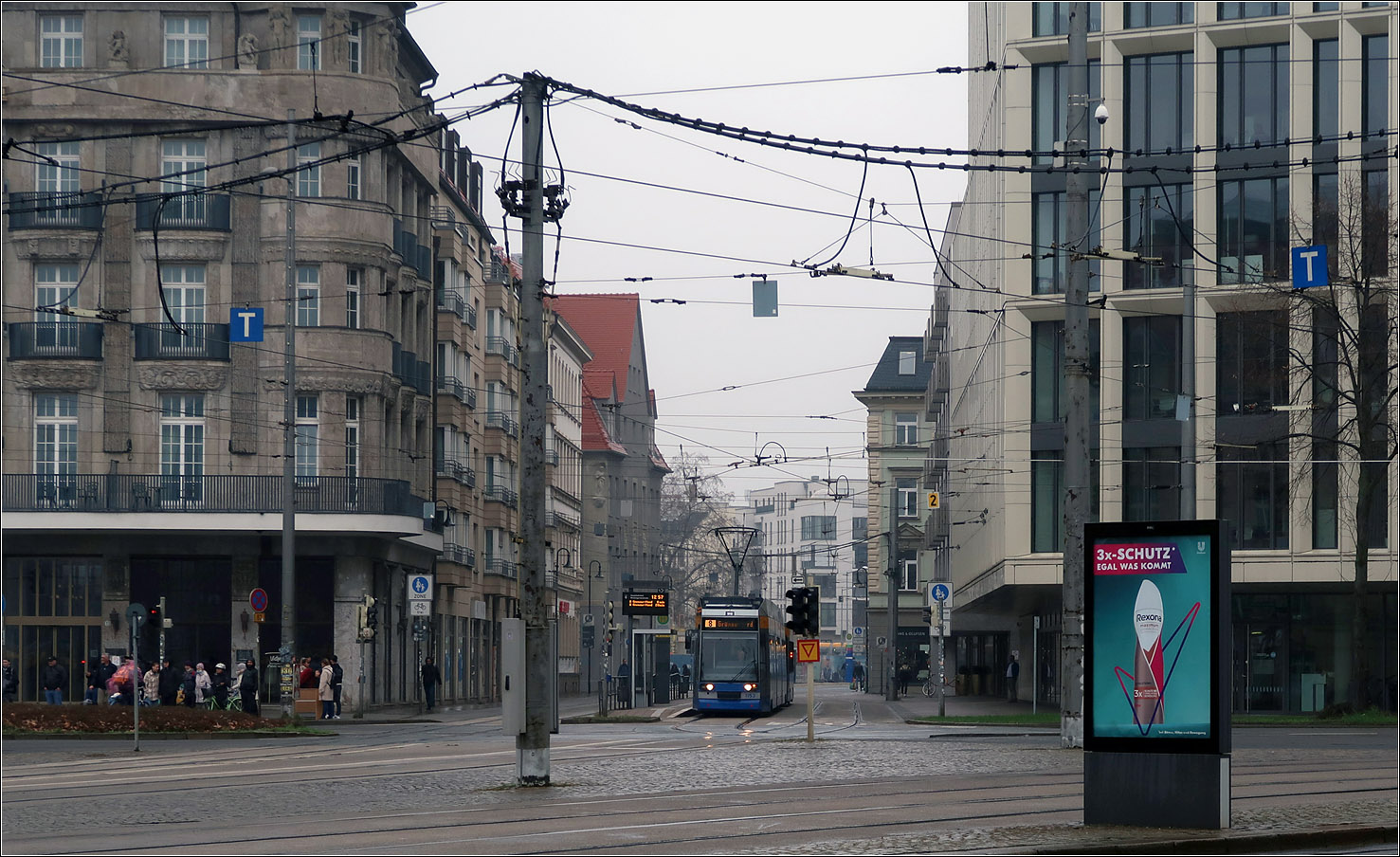 Blick vom Leipziger Willy-Brandt-Platz in die in diesem Abschnitt für Autos gesperrte Weingartenstraße in der die Straßenbahnlinien 1, 3 und 8 verkehren. Während die Linien 1 und 3 zum Hauptbahnhof weiterfahren, biegt die Linie 8 nach Süden in den Georgring ab.