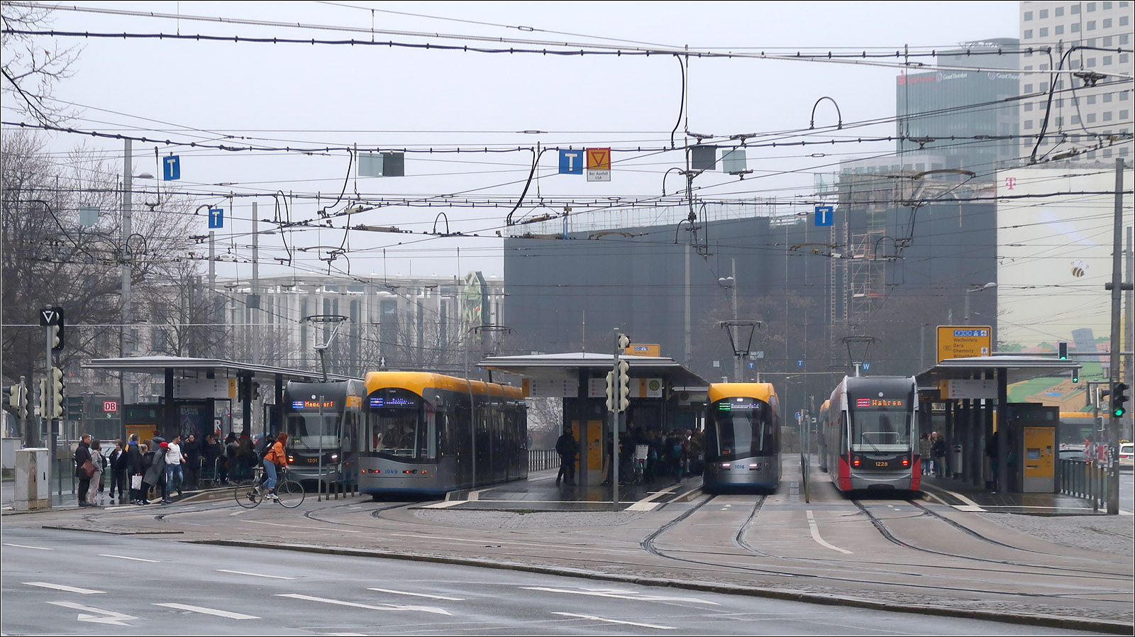 Auf dem Willy-Brandt-Platz befindet direkt vor dem Bahnhofsgebäude (rechts außerhalb des Bildes) die viergleisige Haltestelle für die Straßenbahnen der Linien 1, 3, 4, 7, 10, 11, 12, 14, 15 und 16.