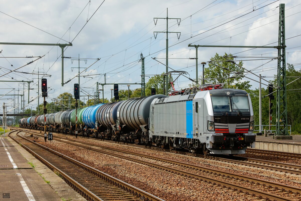 6193 119 Railpool Vectron mit Kesselzug in Berlin Schönefeld Flughafen, August 2023.