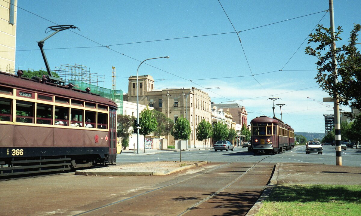 Adelaide Glenelg Tram__Tw 366 und 367 (H-class, 1929) nahe der Abfahrtstelle in Adelaide City.__07-01-1989