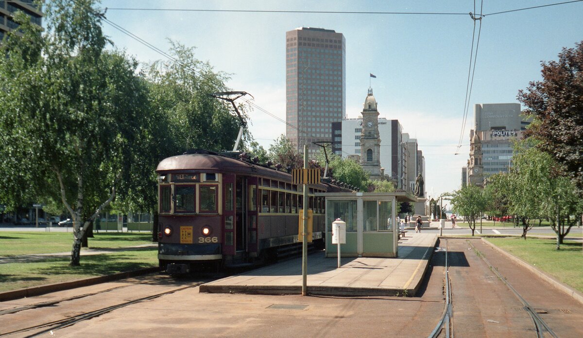 Adelaide Glenelg Tram__Tw 366 nach und 367 von Glenelg nahe der Endstation in Adelaide City.__07-01-1989