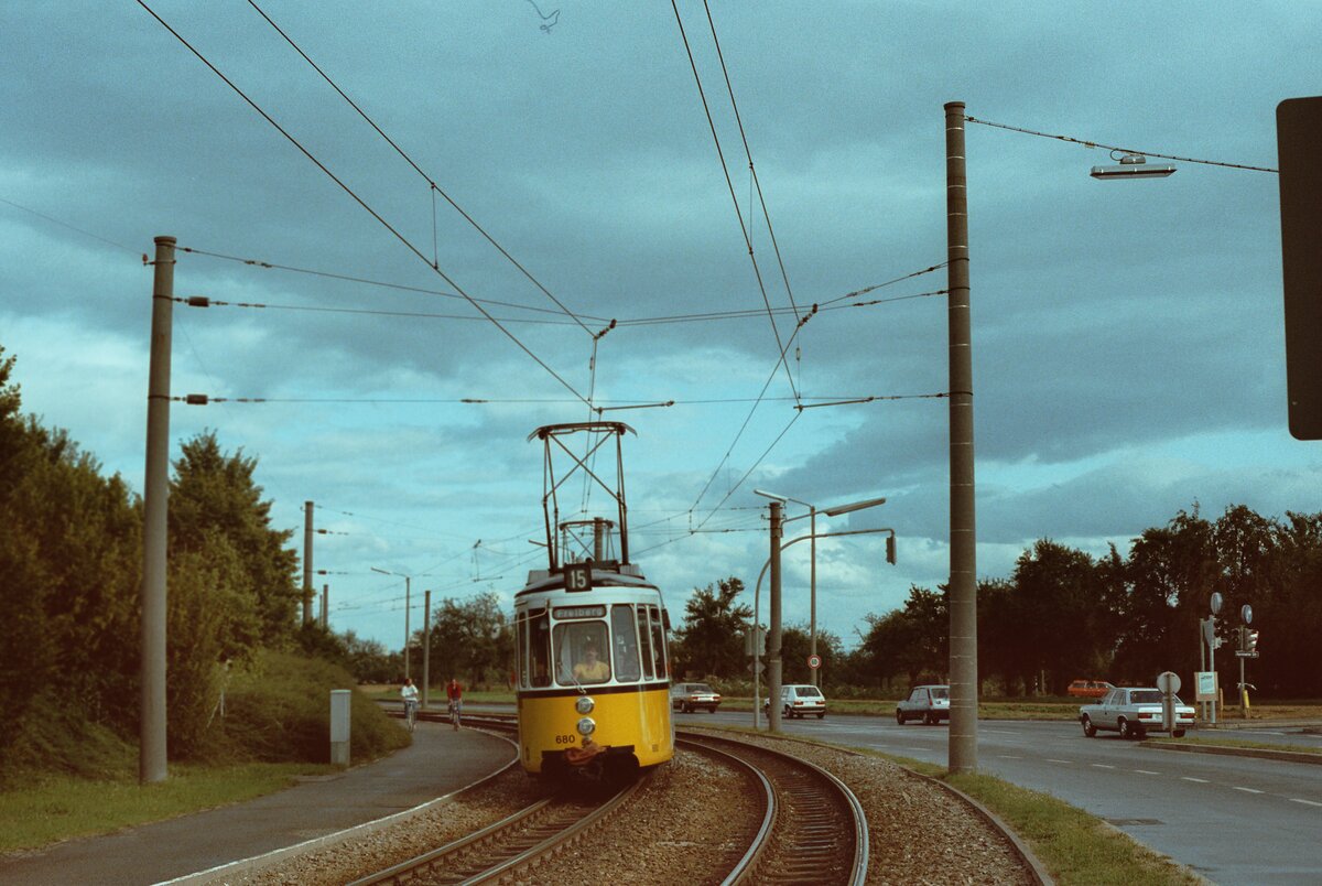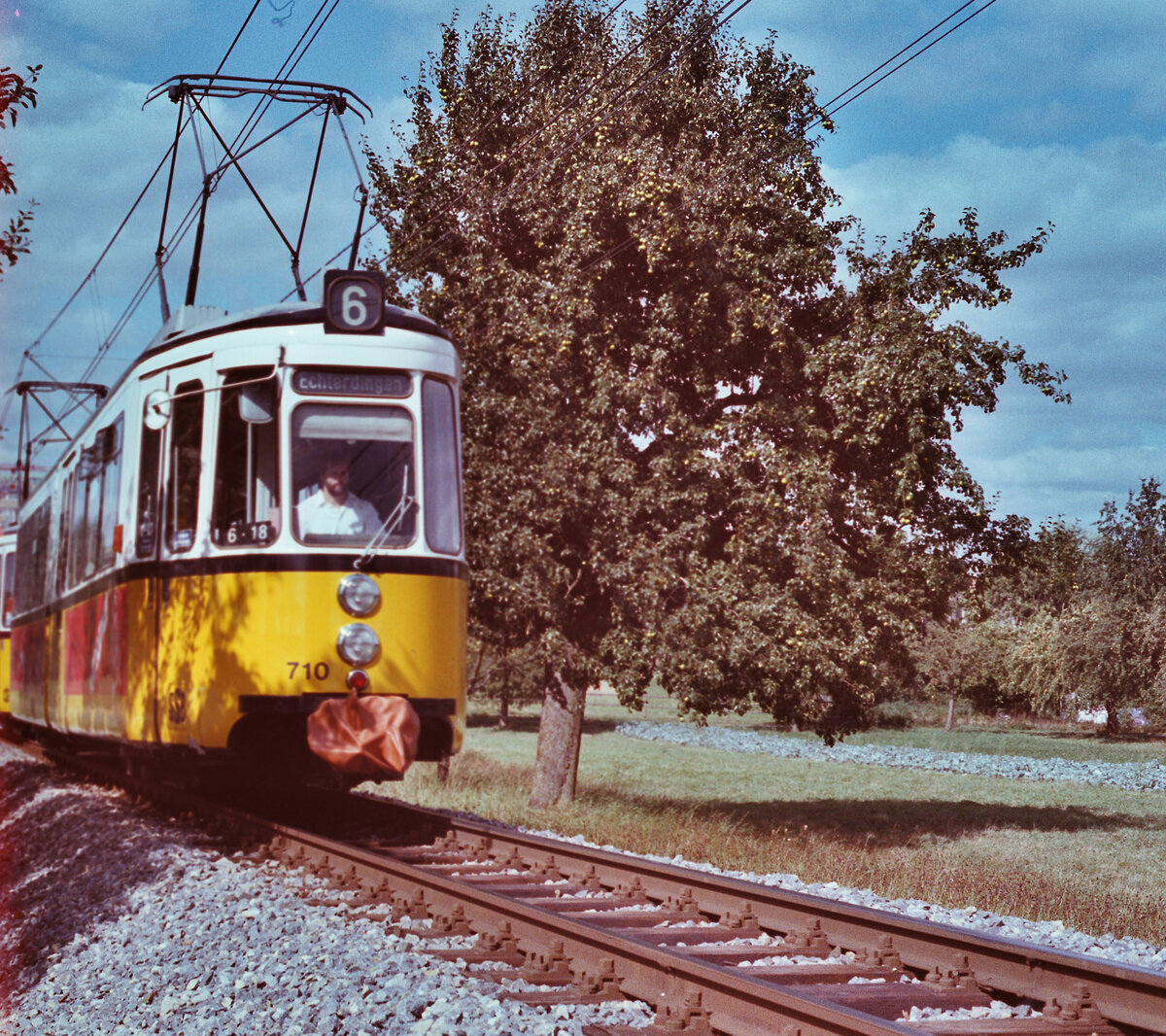 Auf der Linie 6 nach Echterdingen verlief die Straßenbahn hier in Möhringen eingleisig.