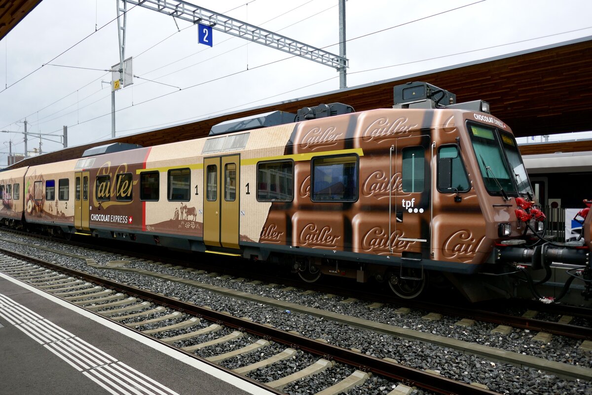 Der ABt 865-7 der TPF mit der "ChocolatExpress" Vollwerbung am 28.8.23 im Bahnhof Bulle.