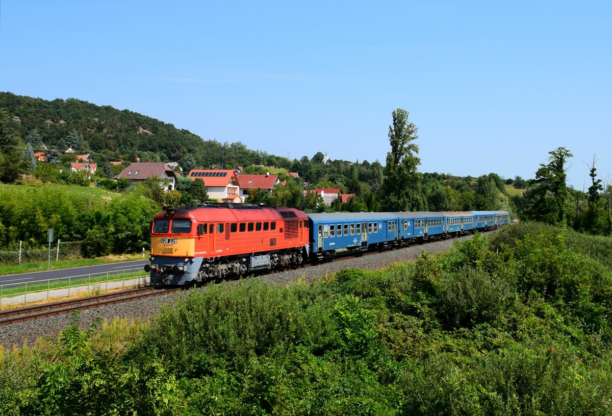 Der Sommer ist mit den Saisonzügen angesagt. Wie hier: die 628 301 (ex. M62 301, die erste remotorisiert ungarische Sergej) ist mit dem 19606 "LESENCE" aus Keszthely nach Szombathely kurz nach Hst. Gógánfa.