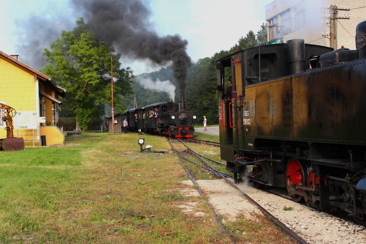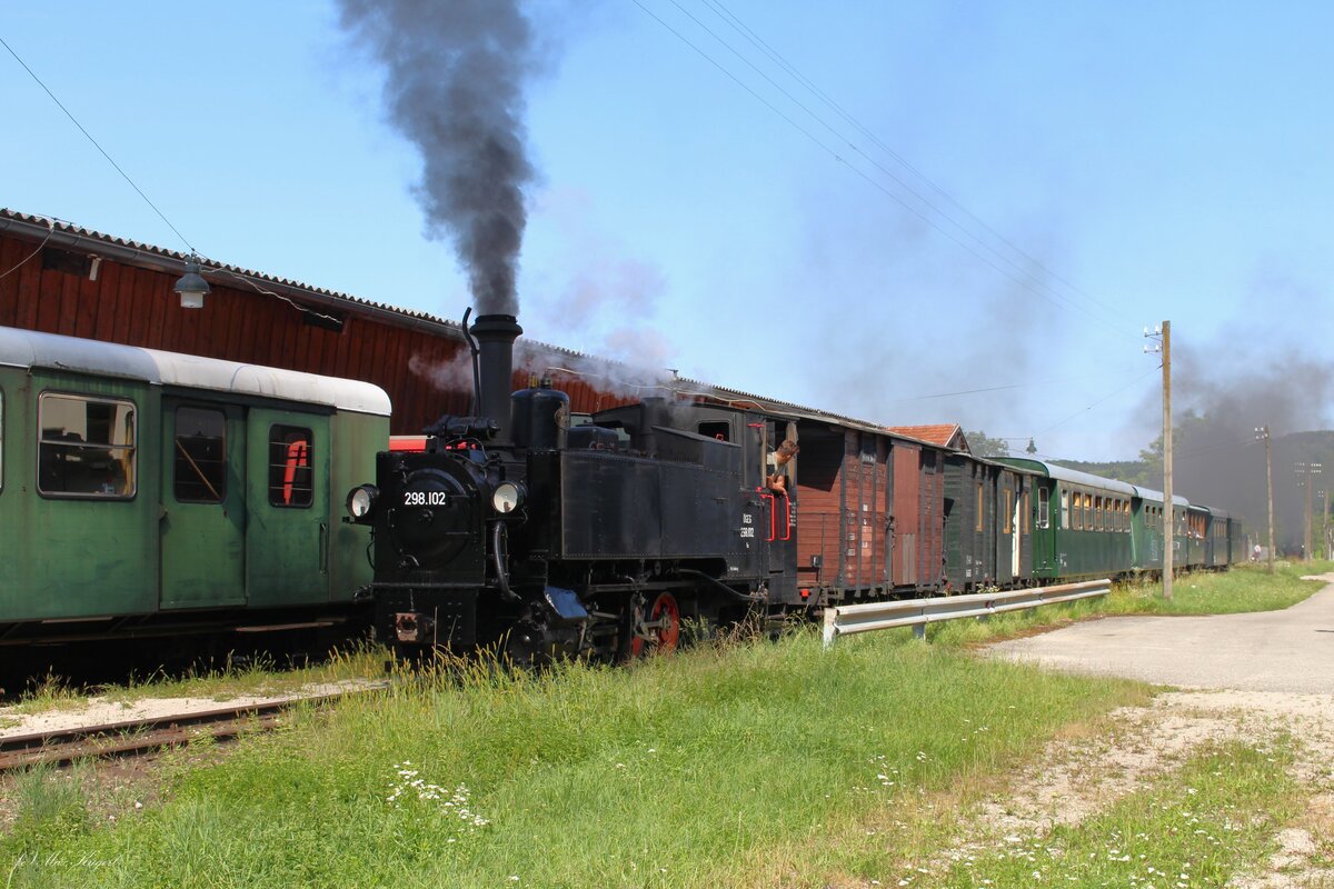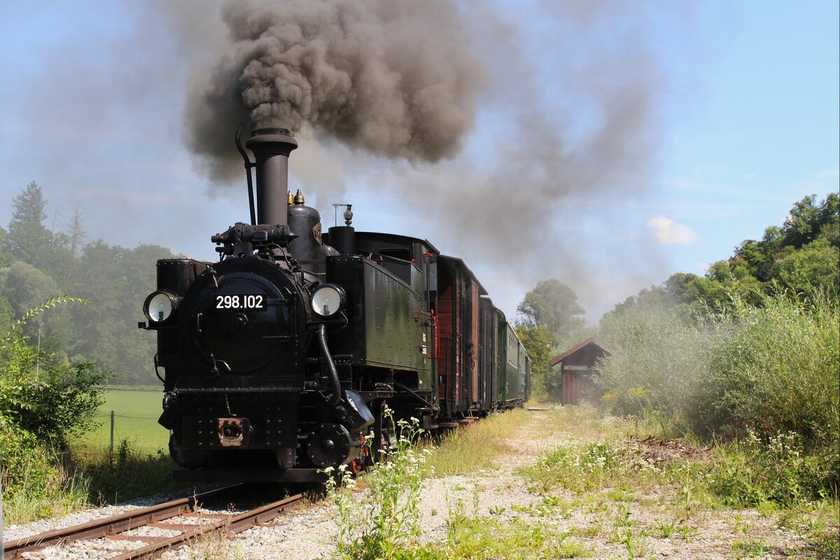 Heizerlehrling Michael hat noch zwei schaufeln Kohle nachgelegt und so verlässt die 298.102 mit dem GK21 mit viel Dampf und lauten Auspuffschlägen die Haltestelle Unterhimmel-Christkindl am 26.8.2023 in Richtung Grünburg.