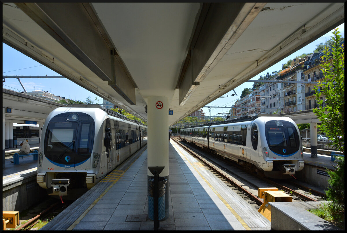 Euskotren Trena: Am 05.08.2023 steht im Bf. San Sebastian (Donostia) Amara links ein CAF-Triebzug der BR 900 abfahrbereit auf Gleis 3 und rechts auf Gleis 1 wartet ebenfalls ein solcher Zug auf weitere Einsätze.