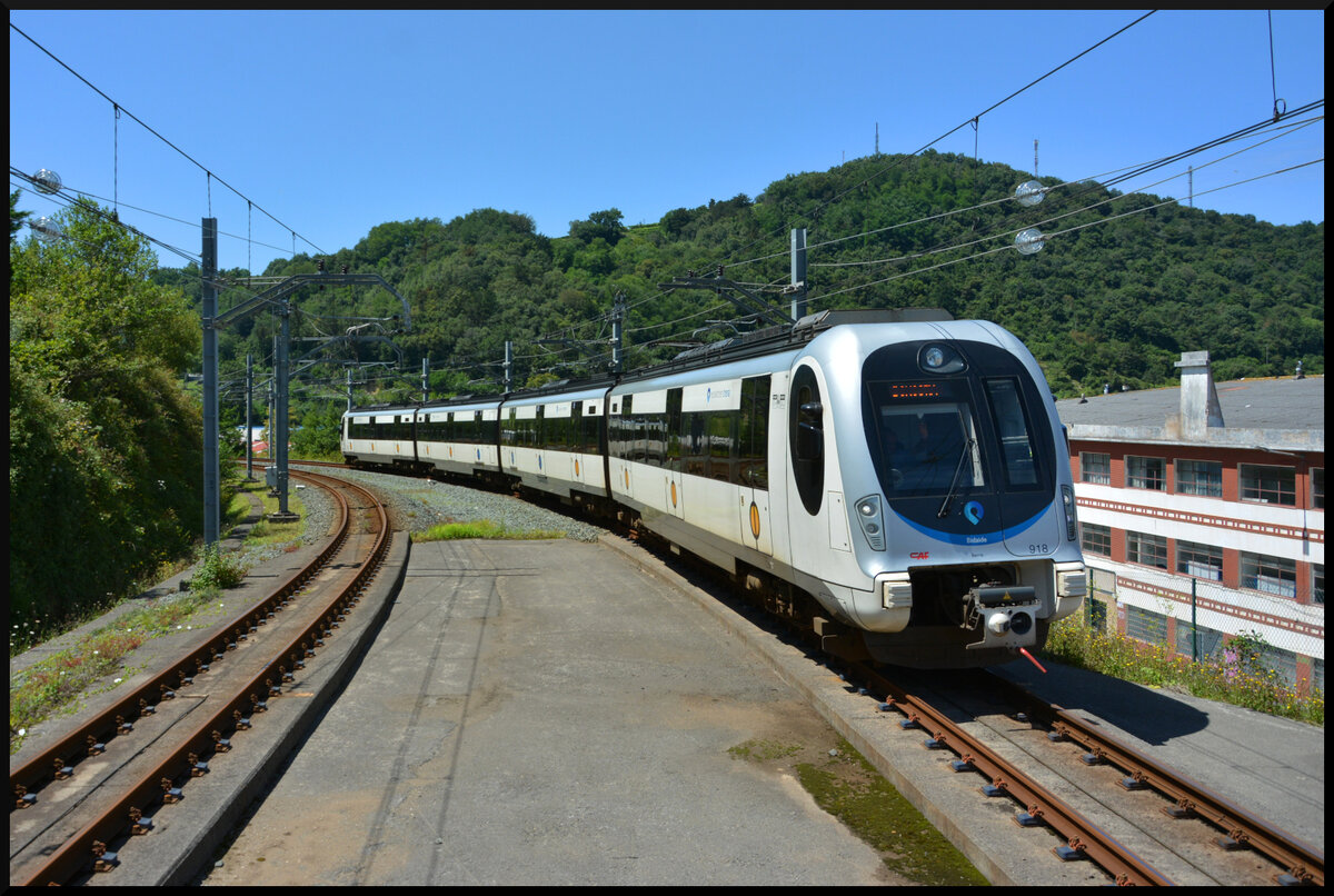 Euskotren Trena: Ein CAF-Triebzug der BR 900 kommt am 05.08.2023 pünktlich in den Bf. Aia-Orio. Wie auf dem Meterspurnetz von Eukotren Trena üblich, sind der Bahnhof, sowie die angrenzenden Brücken und Tunnel mit fester Fahrbahn und LZB ausgestattet.