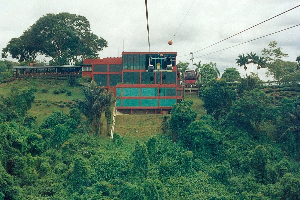 Blick vom Mount Faber auf die Singapore Cable Car MFLG Mount Faber-Linie. Zu erkennen sind neben einigen Gondel die beiden Stütztürme und die im 16.Stockwerk gelegene Harbour Front Station. Bild vom 08.Mai 2002. (Fotoscan)
