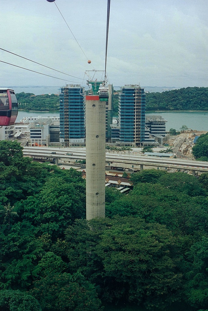 Blick aus der Gondel 42 der Singapore Cable Car MFLG Mount Faber-Linie auf weitere Gondeln, den ersten Stützturm, den Gebäudekomplex in dem sich im 16.Stockwerk die Harbour Front Station befindet, dem Keppel Harbour und die Insel Sentosa. Bild vom 08.Mai 2002. (Fotoscan)