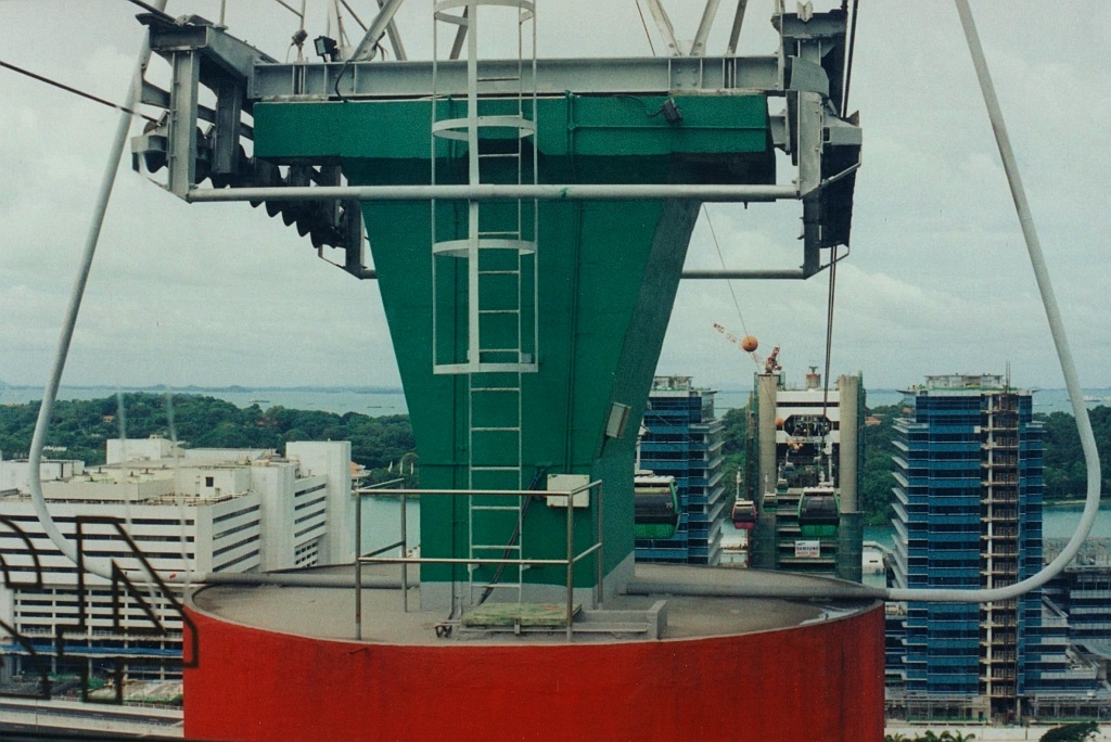 Tragseilstützkonstruktion auf dem Stützturm 1 der Singapore Cable Car MFLG Mount Faber-Linie, Tragseilhöhe 80 m über dem Meer. Bild vom 08.Mai 2002. (Fotoscan)