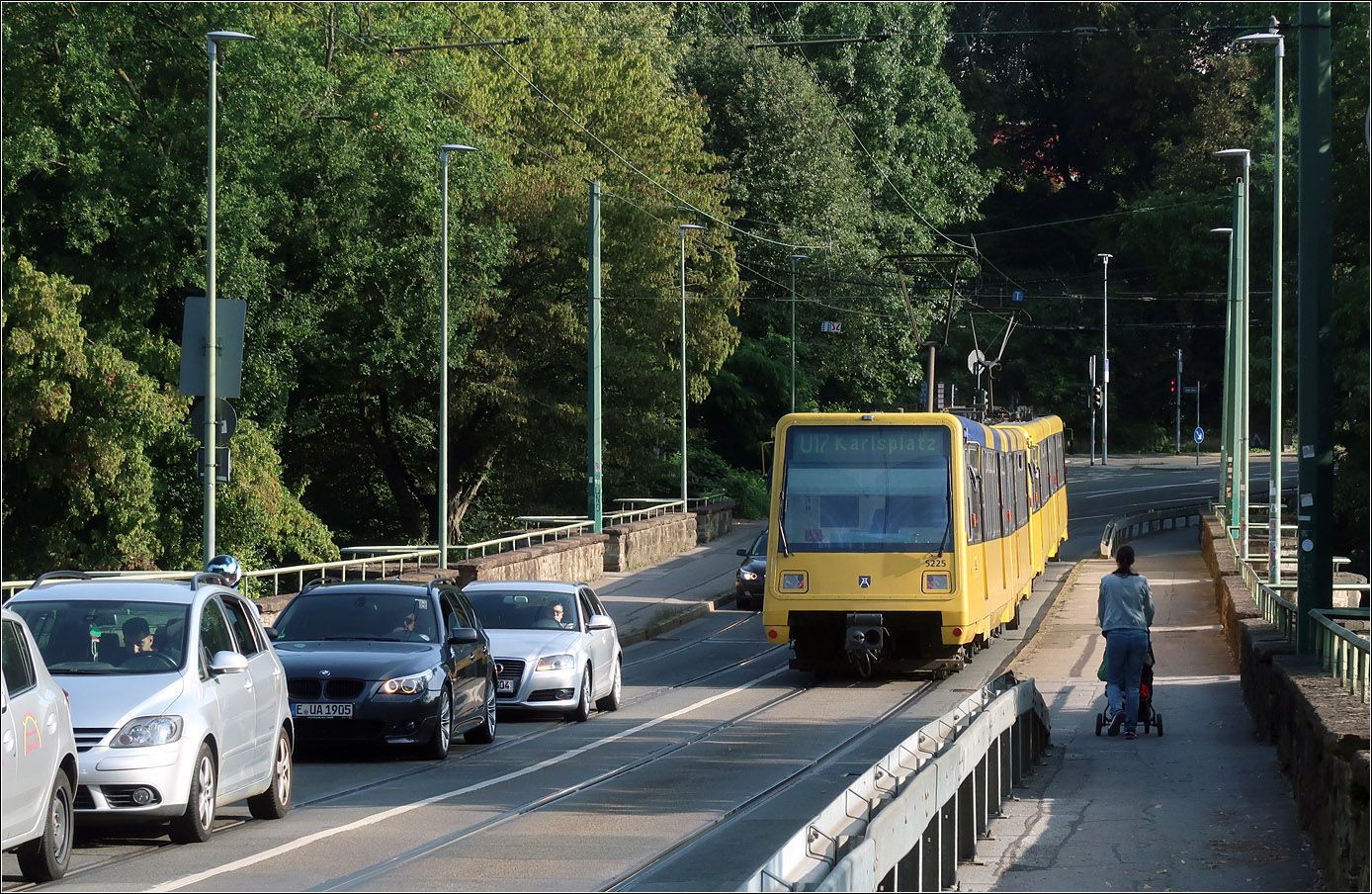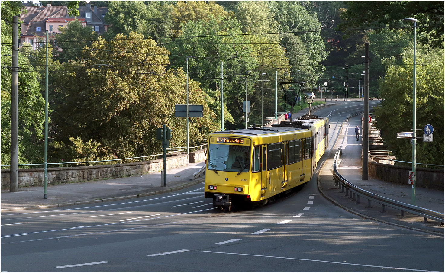 Unterhalb der Haltestelle Halbe Höhe führt die Stadtbahnstrecke über eine kleine Talbrücke. Die Bahnen müssen auf der Brücke den Platz mit den Autos teilen. Hier hat der Ex-Londoner Stadtbahnzug die Haltestelle Halbe Höhe verlassen und erreicht nach einer Linkskurve die Brücke.
