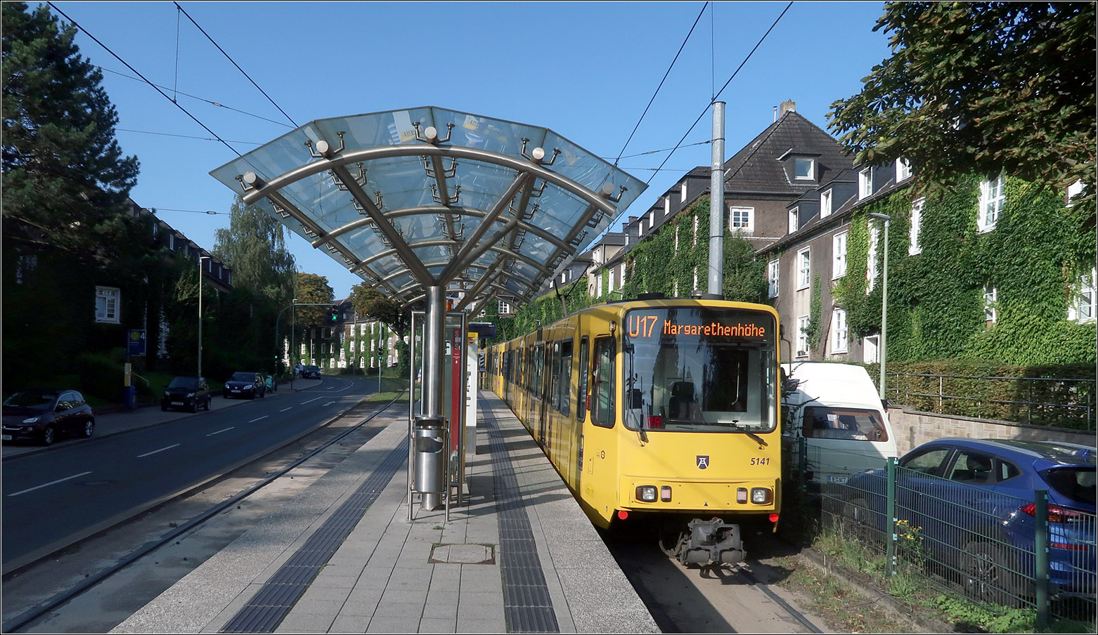 Im Gegensatz zu den Tramlinien sind die Stadtbahnen in Essen meist in Doppeltraktion unterwegs. Hier zwei B-Wagen zwischen den Haltestellen Laubenweg und Halbe Höhe in Fahrtrichtung Innenstadt.