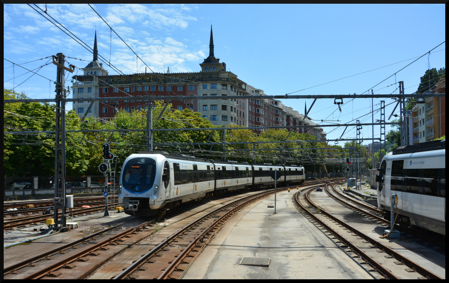 Fast ausschließlich Triebzüge der Renfe-Baureihe 446/447 fahren den Kopfbahnhof Bilbao Abando an. 12.08.2023