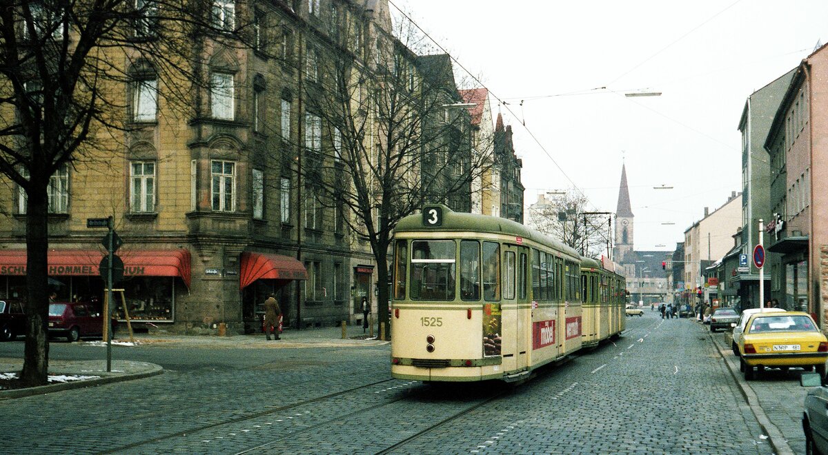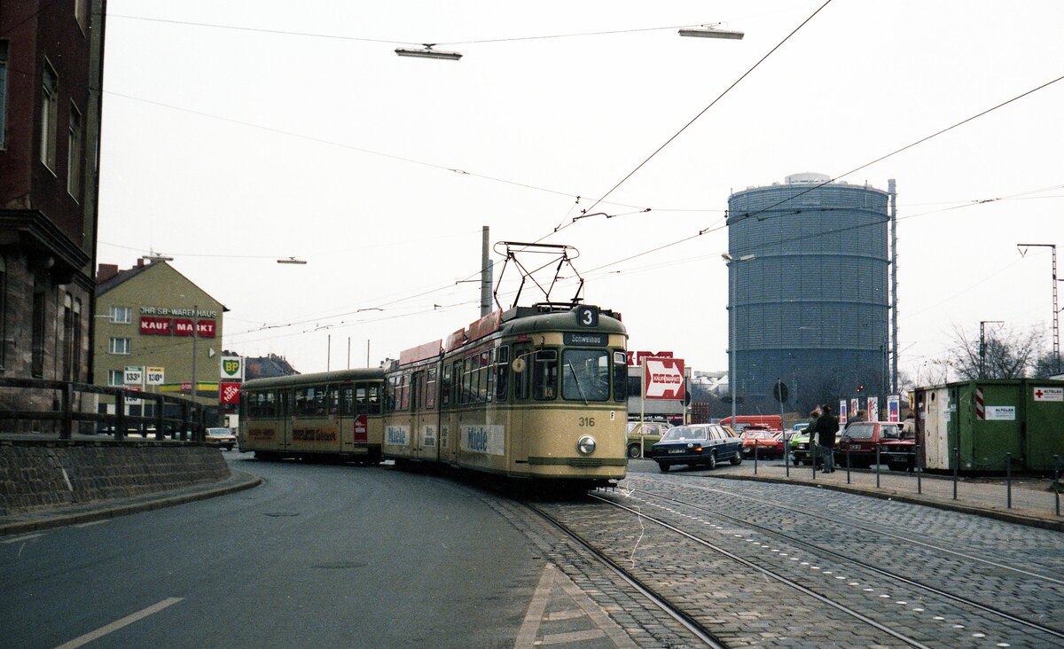Straßenbahn Nürnberg__Linie 3 von Schweinau kommend in der Bauerngasse in Gostenhof beim heutigen, verkehrsberuhigten Petra-Kelly-Platz. Das Gebäude ganz rechts und die kleinen Häuschen wurden längst durch raumfüllende Einheitsarchitektur ersetzt.__21-01-1984