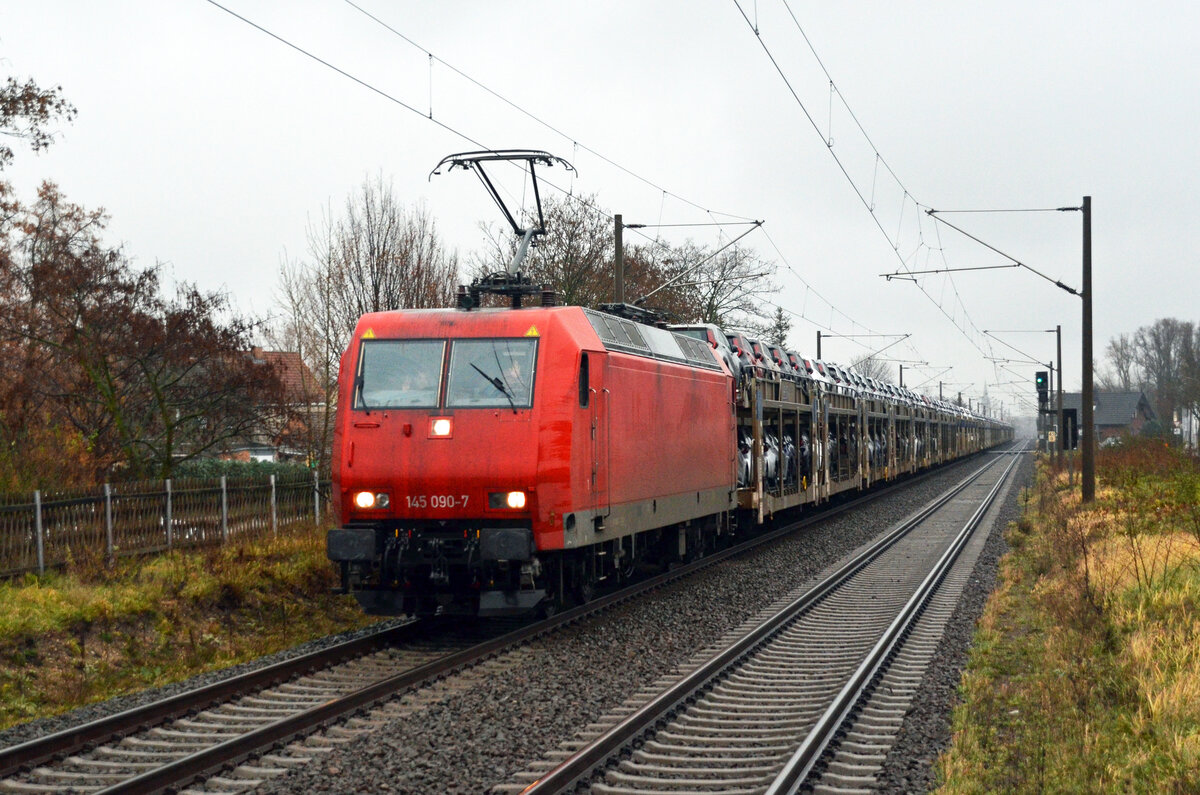 145 090 der BRLL führte am 14.12.23 einen BLG-Autozug durch Greppin Richtung Dessau. Gruß zurück! Fotografiert vom Bahnsteigende.