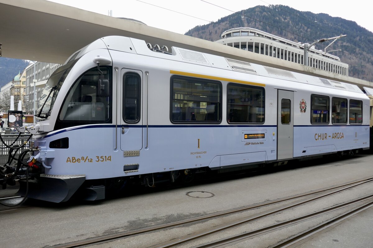 Der neulackierte "Ahnenzug" ABe 8/12 3514 im Retro Design der Bahnen von vor der Fusion am 26.12.23 auf dem Bahnhofplatz Chur.