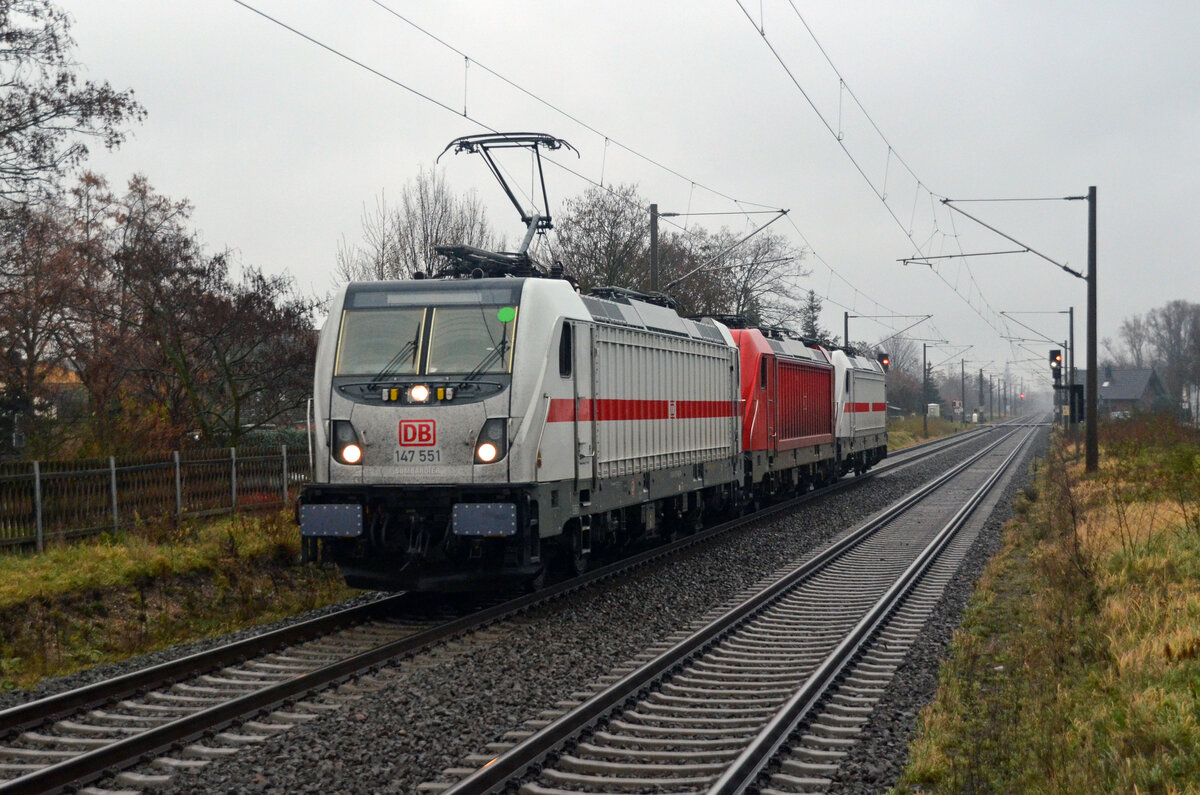 101 125 beförderte am 12.12.23 IC-Wagen von Dortmund nach Leipzig-Engelsdorf ins dortige SSM. Hier passiert der aus 14 Wagen bestehende Zug Greppin.