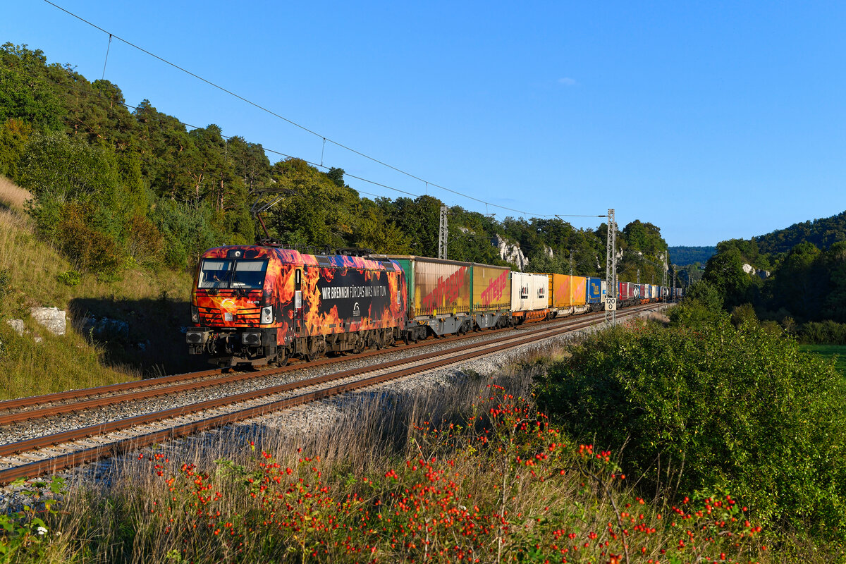 Am 25. September 2023 bespannte die 193 878 den DGS 43104 zwischen Kufstein und Leipzig Wahren. Bei Hagenacker im Altmühltal konnte ich den bunten KLV-Zug im warmen Abendlicht aufnehmen. Der Feuer-Vectron hat inzwischen den Eigentümer gewechselt und gehört nun dem Unternehmen Beacon Rail Metro Finance B.V., das alle Anteile der MRCE B.V. von der Mitsui & Co. Ltd. übernommen hat. Daher trägt die Lok auch inzwischen anstatt der MRCE-Logos an den Führerstandstüren dort den stilisierten gelben Kreis von Beacon Rail.