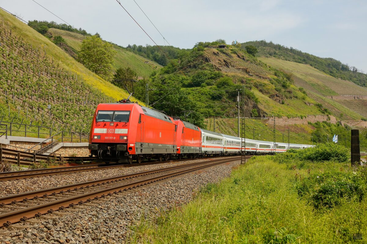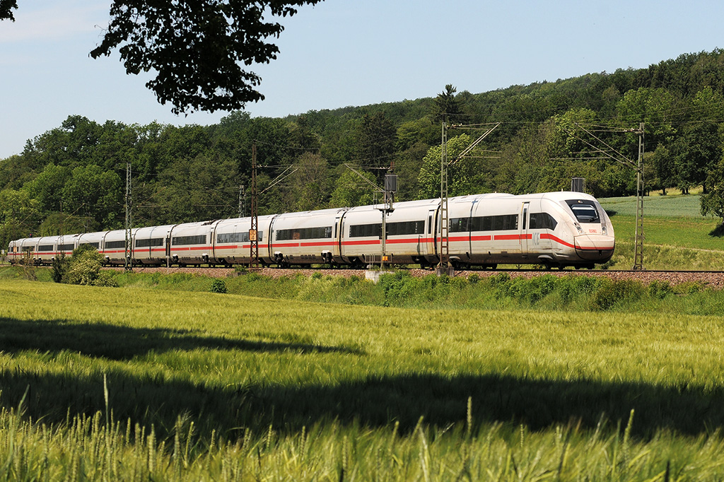 DB 101 083-4 fährt mit dem IC 2085  Nebelhorn  (Hamburg-Altona - Oberstdorf) und dem IC 2083  Königsee  (Hamburg-Altona - Berchtesgarden) bei Uffenheim in Richtung Ansbach. (20.06.2023)