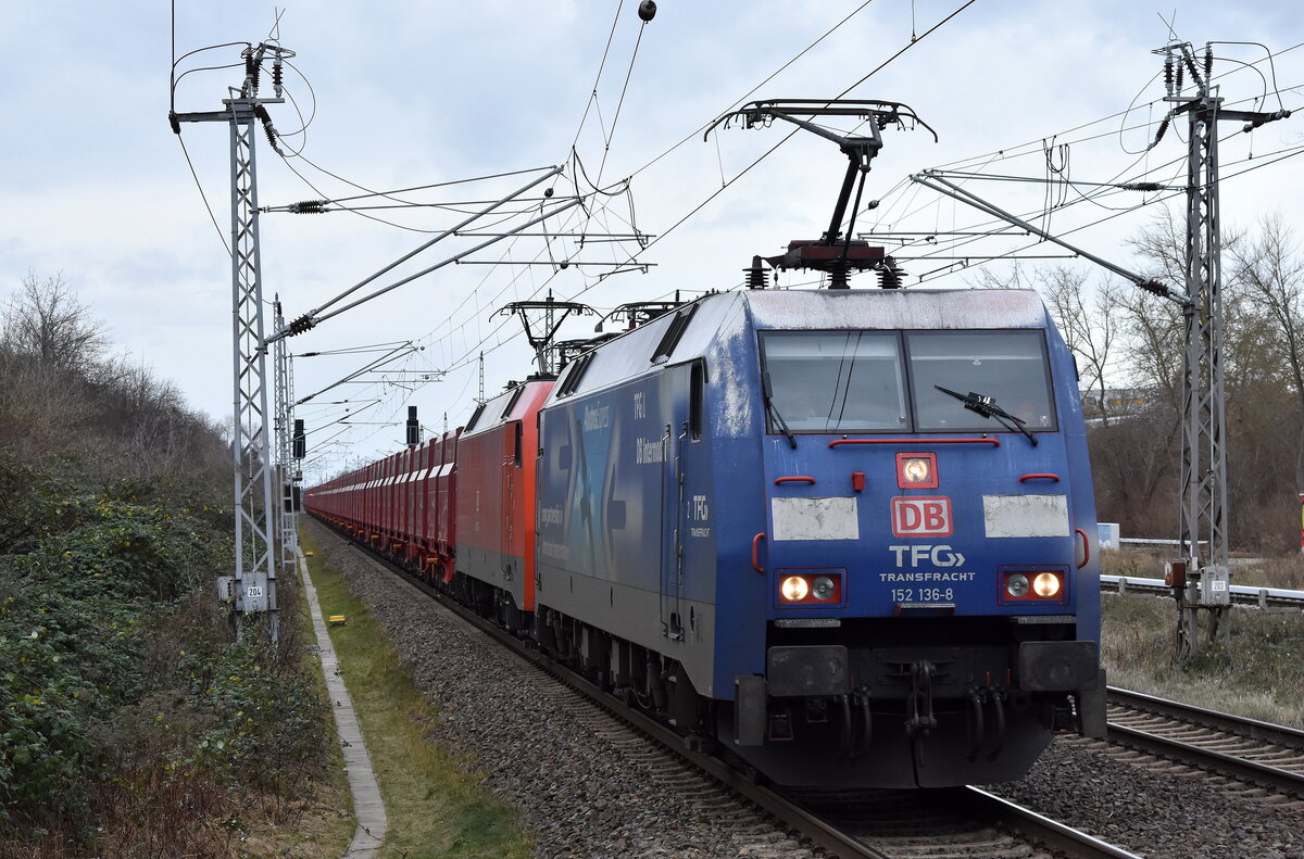 DB Cargo AG, Mainz mit der Doppeltraktion  152 136-8  (NVR:  91 80 6152 136-8 D-DB ) +  152 132-7  (NVR:  91 80 6152 132-7 D-DB ) mit dem Erzzug aus Hamburg Richtung Ziltendorf EKO am 29.12.23 Durchfahrt Bahnhof Berlin-Hohenschönhausen.